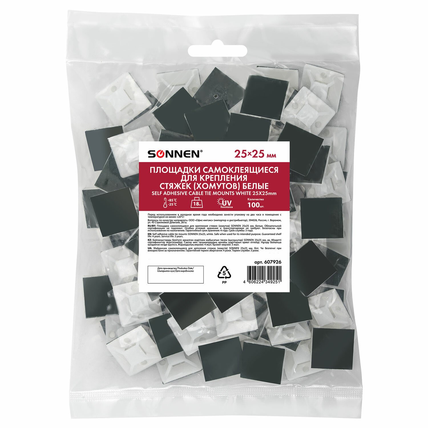 Площадка самоклеящаяся для крепления стяжки (хомута) 25х25 мм, КОМПЛЕКТ 100 штук, белая, SONNEN, 607926