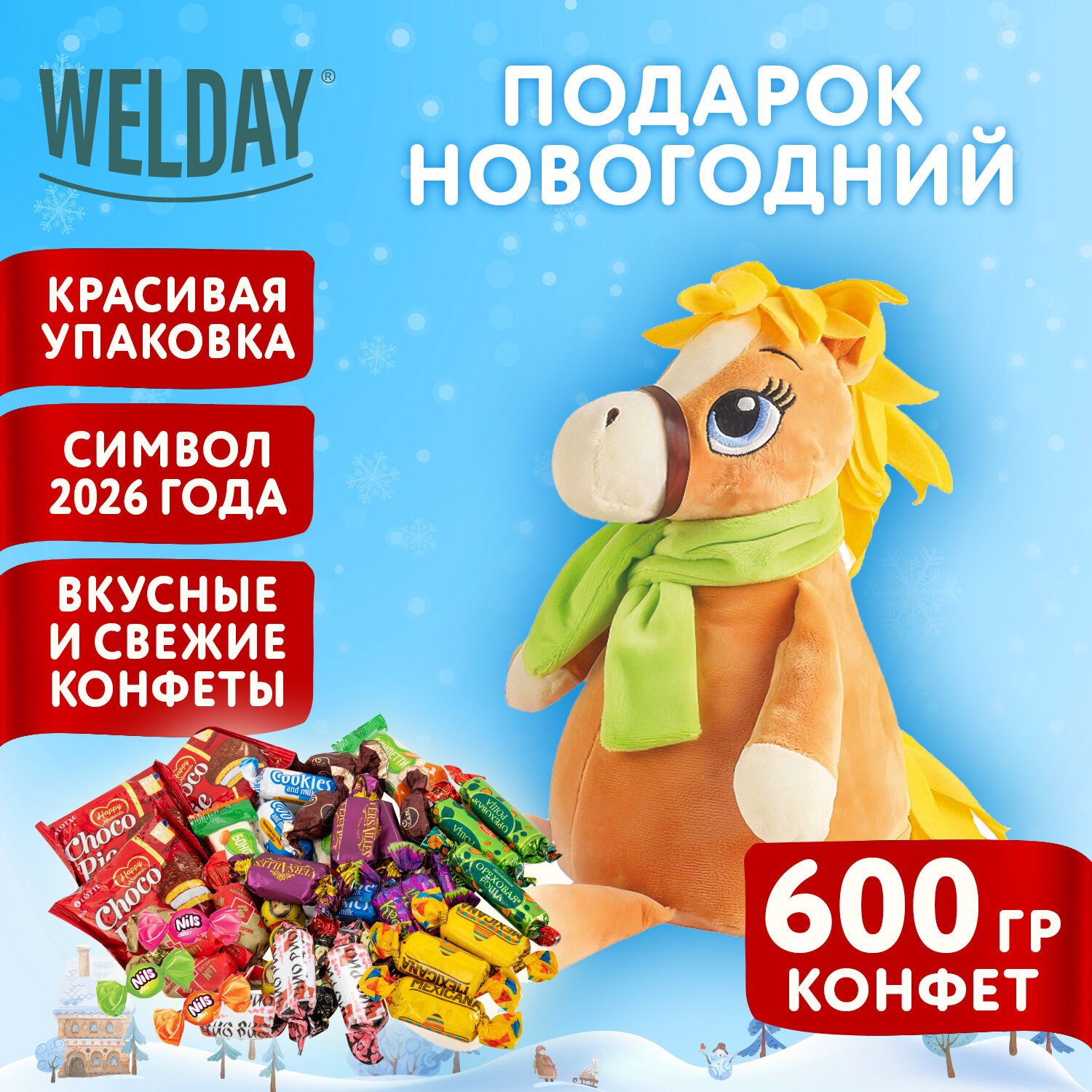 Подарок новогодний ВЕСЕЛЬЧАК В ШАРФЕ "Мягкая игрушка-символ 2026 года", НАБОР конфет 600г, WELDAY