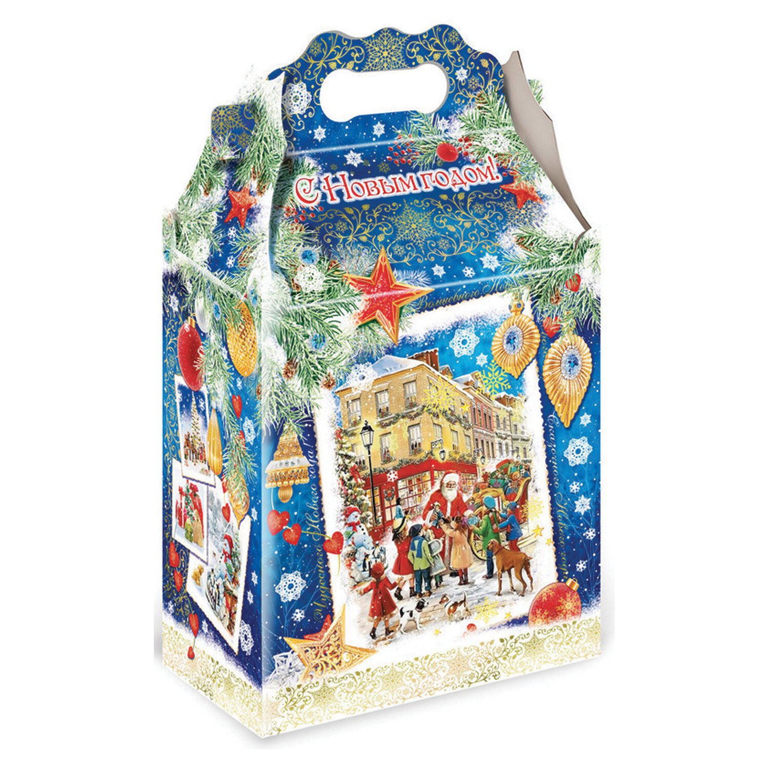 Новогодний подарок "НОВОГОДНИЕ ТРАДИЦИИ" МОСУПАК – это сладости в картонной коробке с новогодним дизайном. Упаковка имеет удобную ручку для переноски. 1500 г популярных кондитерских изделий обязательно придутся по вкусу всем сладкоежкам!