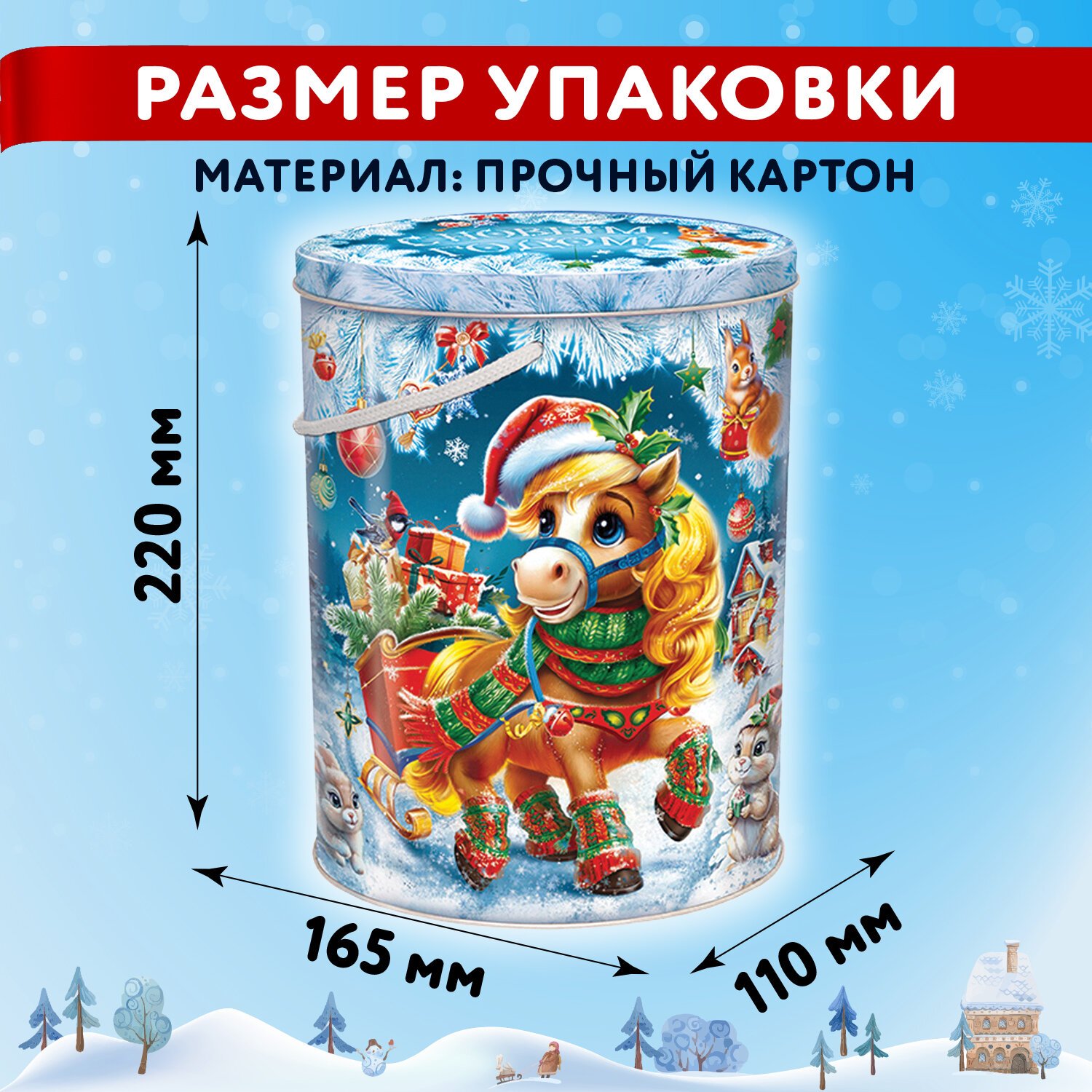 Новогодний подарок "НОВОГОДНИЙ КУРЬЕР" МОСУПАК – это сладости в жестяной тубе с новогодним дизайном. Упаковка имеет удобную ручку для переноски. 1000 г вкуснейших кондитерских изделий обязательно придутся по вкусу всем сладкоежкам!