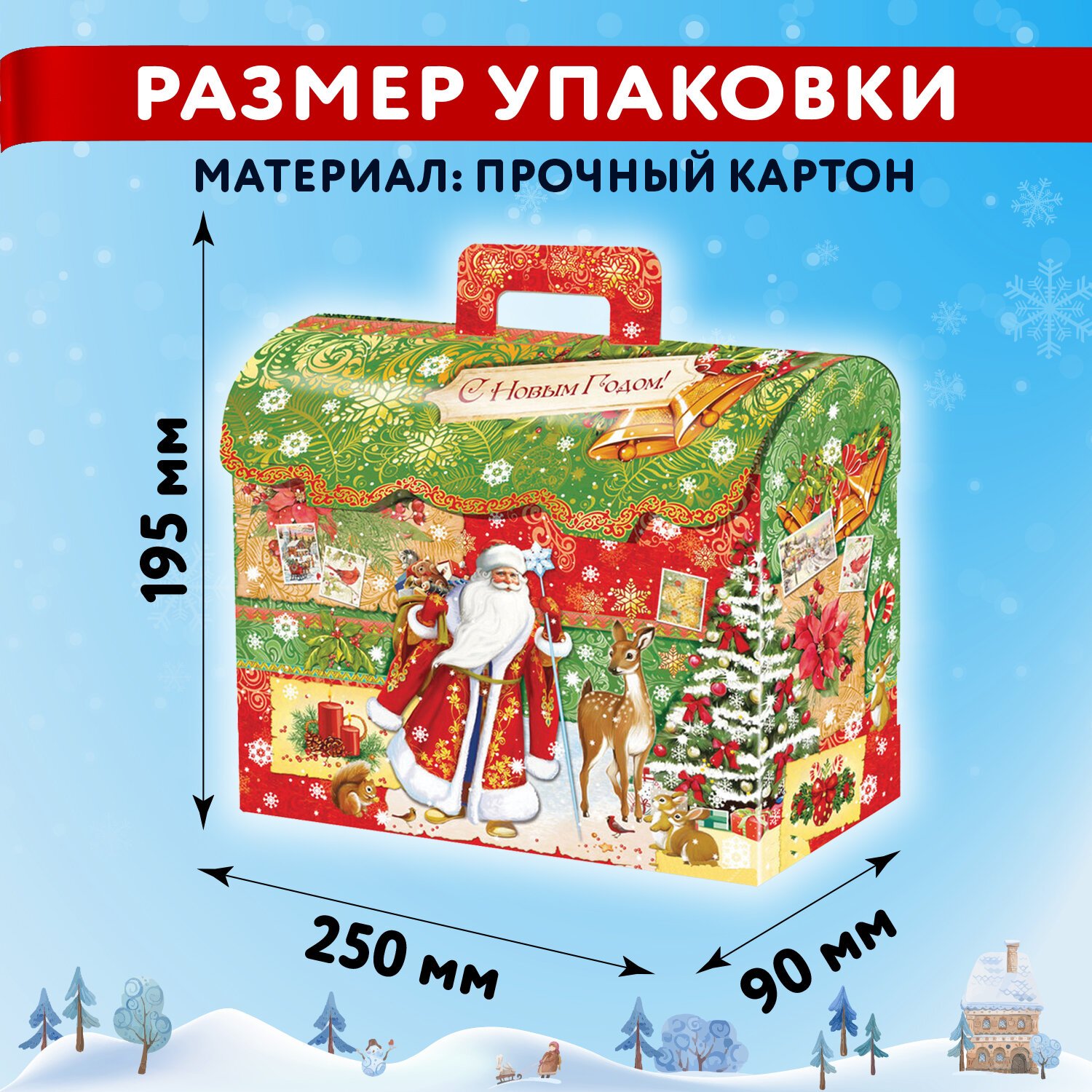 Новогодний подарок "СУНДУК СПЕШУ НА ПРАЗДНИК" МОСУПАК – это сладости в картонной коробке с новогодним дизайном. Упаковка имеет удобную ручку для переноски. 1000 г популярных кондитерских изделий обязательно придутся по вкусу всем сладкоежкам!