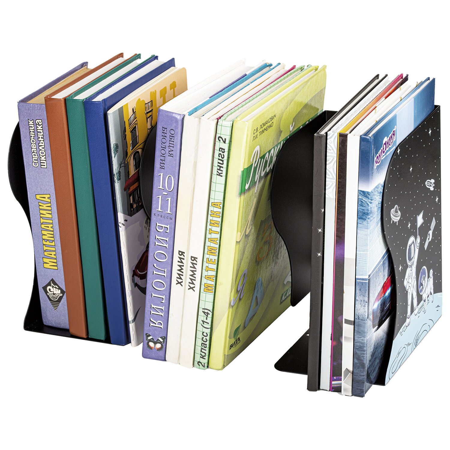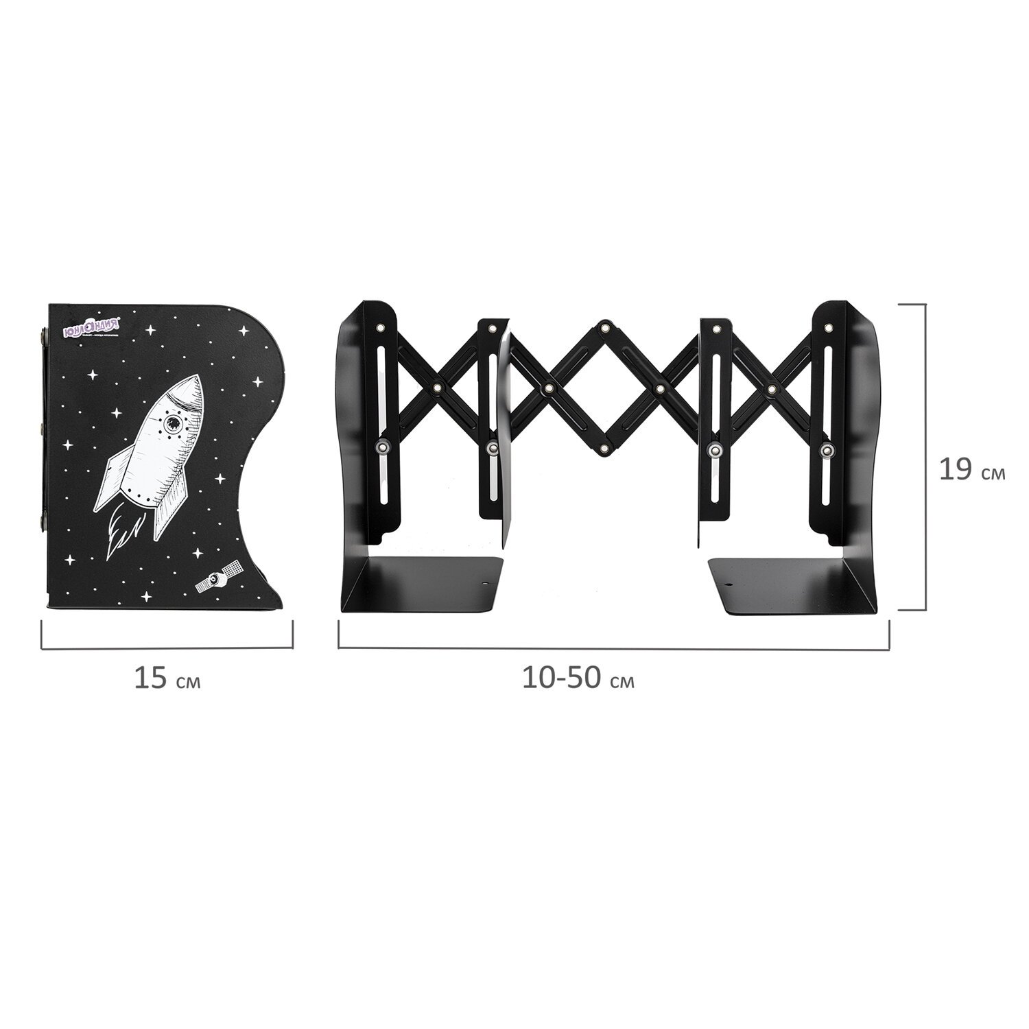 Подставка-держатель полностью изготовлена из металла, что делает ее максимально прочной и долговечной. Держатель для книг раздвигается от 10 до 50 см, что позволит разместить большее количество книг и учебников. Оригинальный дизайн понравится как младшим школьникам, так и школьникам среднего звена. Выполнена в классическом черном цвете. Размер:19х15 см.