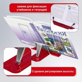 Удобный упор удерживает учебник в вертикальном положении, облегчая чтение и подготовку домашней работы. Компактные размеры и вес подставки позволят разместить ее в любой сумке и взять с собой. Угол наклона регулируется, обеспечивая удобство при работе с текстом. Нижние страницы надежно фиксируются прочным держателем. Корпус, держатель и основание выполнены из металла. Размер подставки - 23,3х16,3 см.
