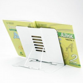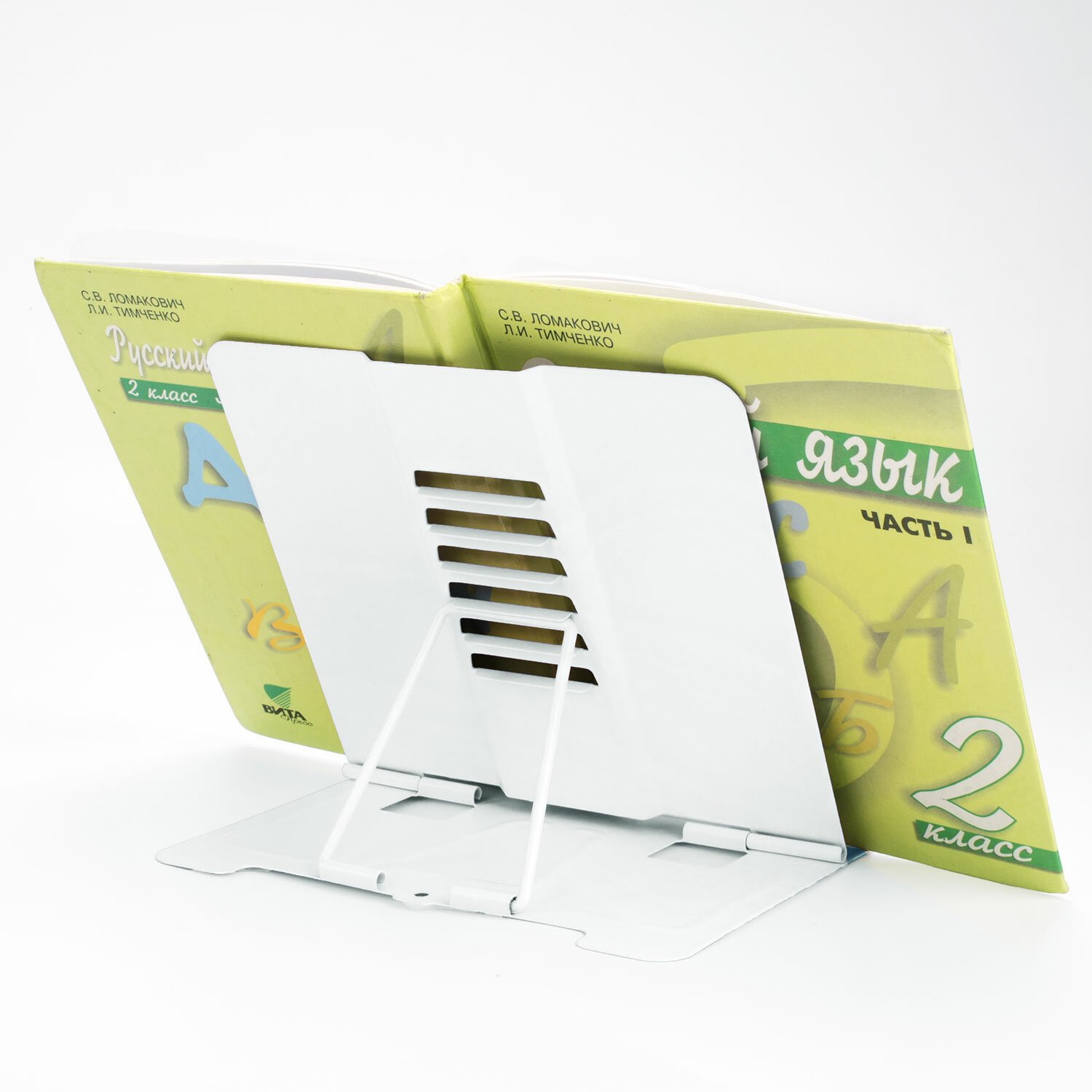 Подставка полностью изготовлена из металла, поэтому отлично подойдет для надежной фиксации тяжелых и объемных учебных материалов и книг. Оригинальный дизайн понравится как младшим школьникам, так и школьникам среднего звена. Регулируемый угол наклона обеспечивает удобство при работе с текстом, облегчает чтение и подготовку домашней работы. Размер подставки – 20х18,5 см. Цвет – белый.