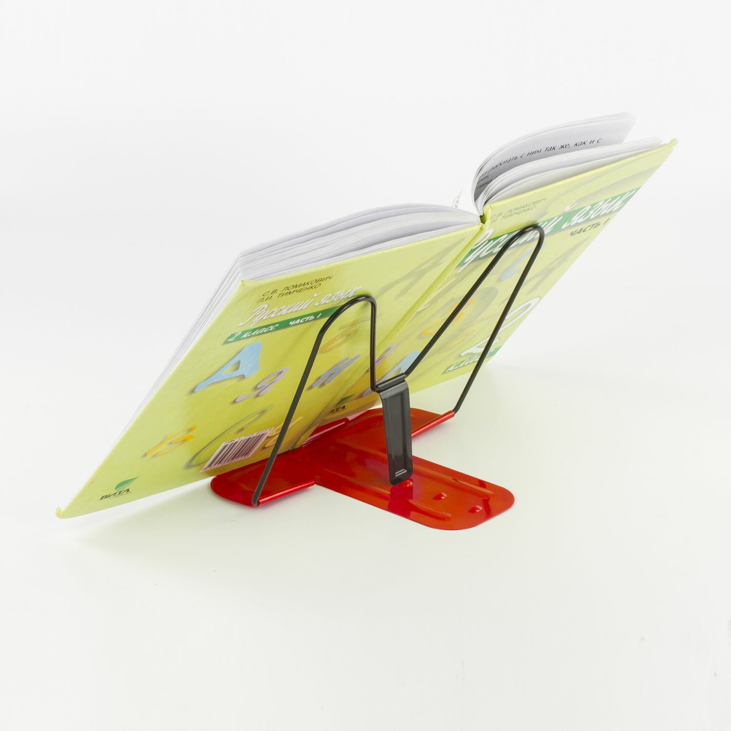 Удобный упор удерживает учебник в вертикальном положении, облегчая чтение и подготовку домашней работы. Компактные размеры и вес подставки позволят разместить ее в любой сумке и взять с собой. Угол наклона регулируется, обеспечивая удобство при работе с текстом. Нижние страницы надежно фиксируются прочным держателем. Корпус, держатель и основание выполнены из металла. Размер подставки - 21х17,2 см. Цвет - красный.