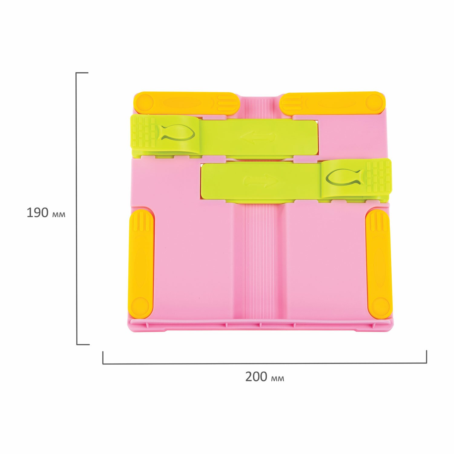 Изготовлена из прочного пластика. Регулируемый угол наклона обеспечивает удобство при работе с текстом, облегчает чтение и подготовку домашней работы. Благодаря боковым зажимам можно легко регулировать размер под ширину книги. Размер подставки - 19х20 см. Цвет: розовый.