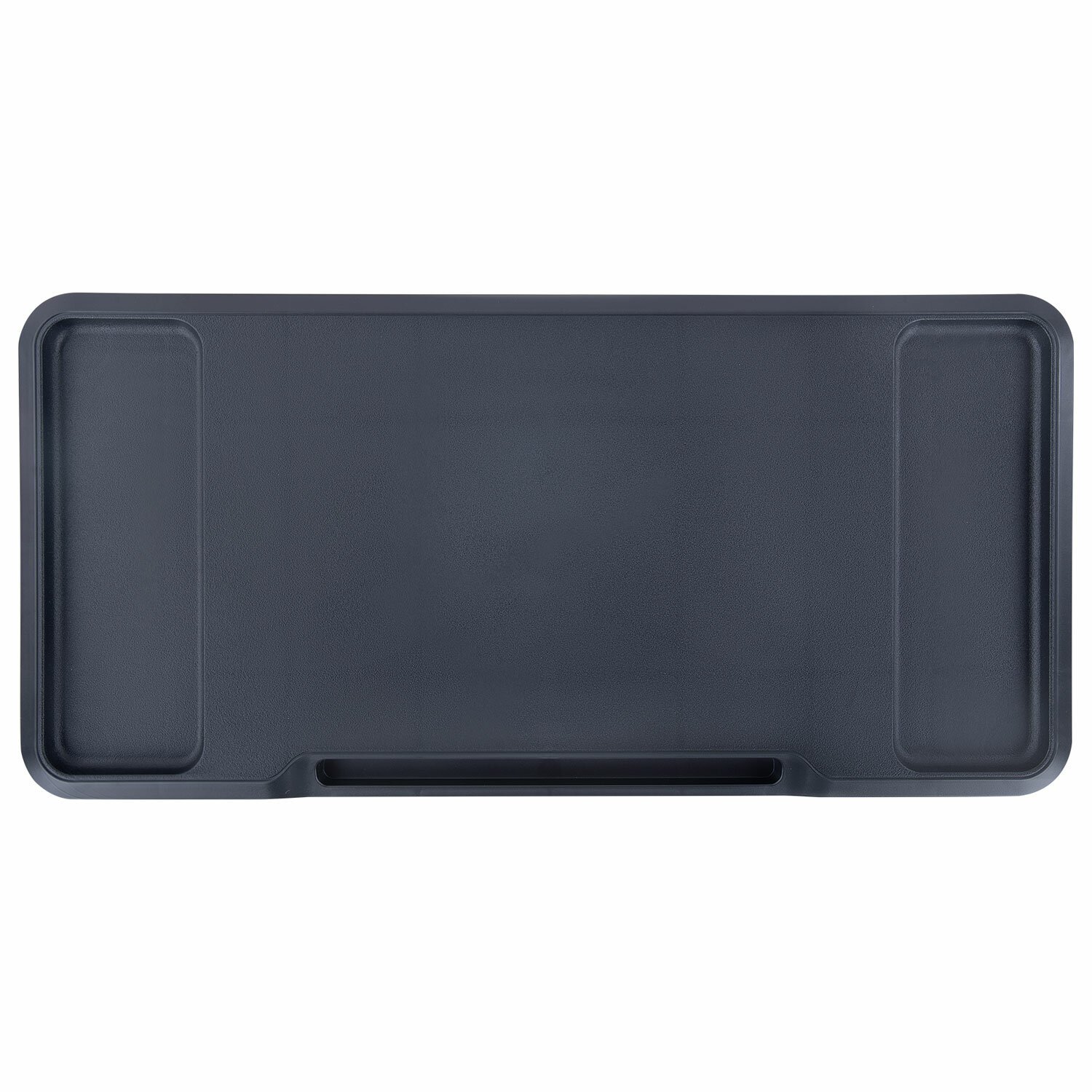 Конструкция подставки оборудована специальными углублениями для телефона и канцелярских принадлежностей. Длина подставки позволяет поместить под нее стандартную клавиатуру. Все это позволяет максимально оптимизировать рабочий процесс и экономит пространство на столе.