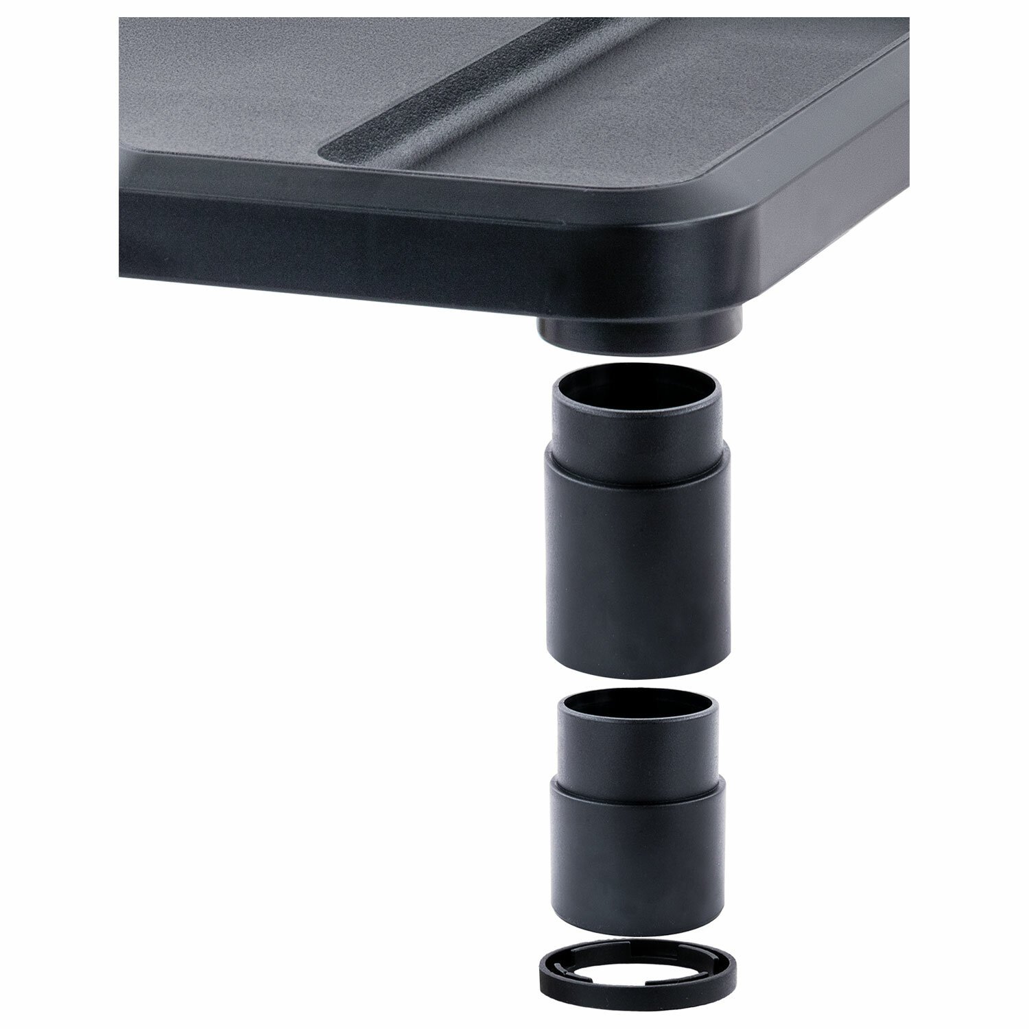 Максимальная нагрузка подставки – 15 кг. Изготовлена из долговечного высококачественного материала – ударопрочного полистирола. Резиновые накладки опор предохраняют поверхность стола от повреждений и предотвращают скольжение.