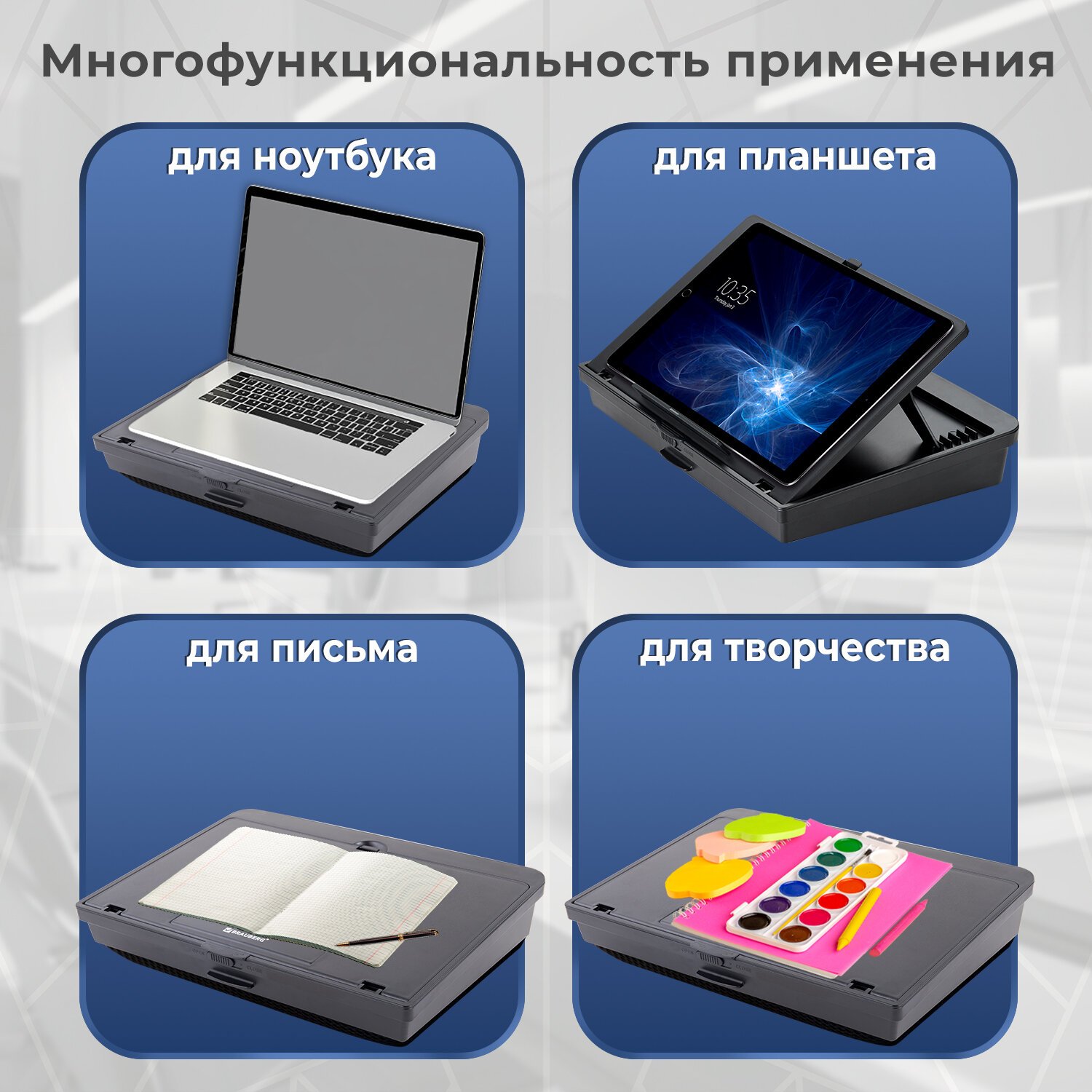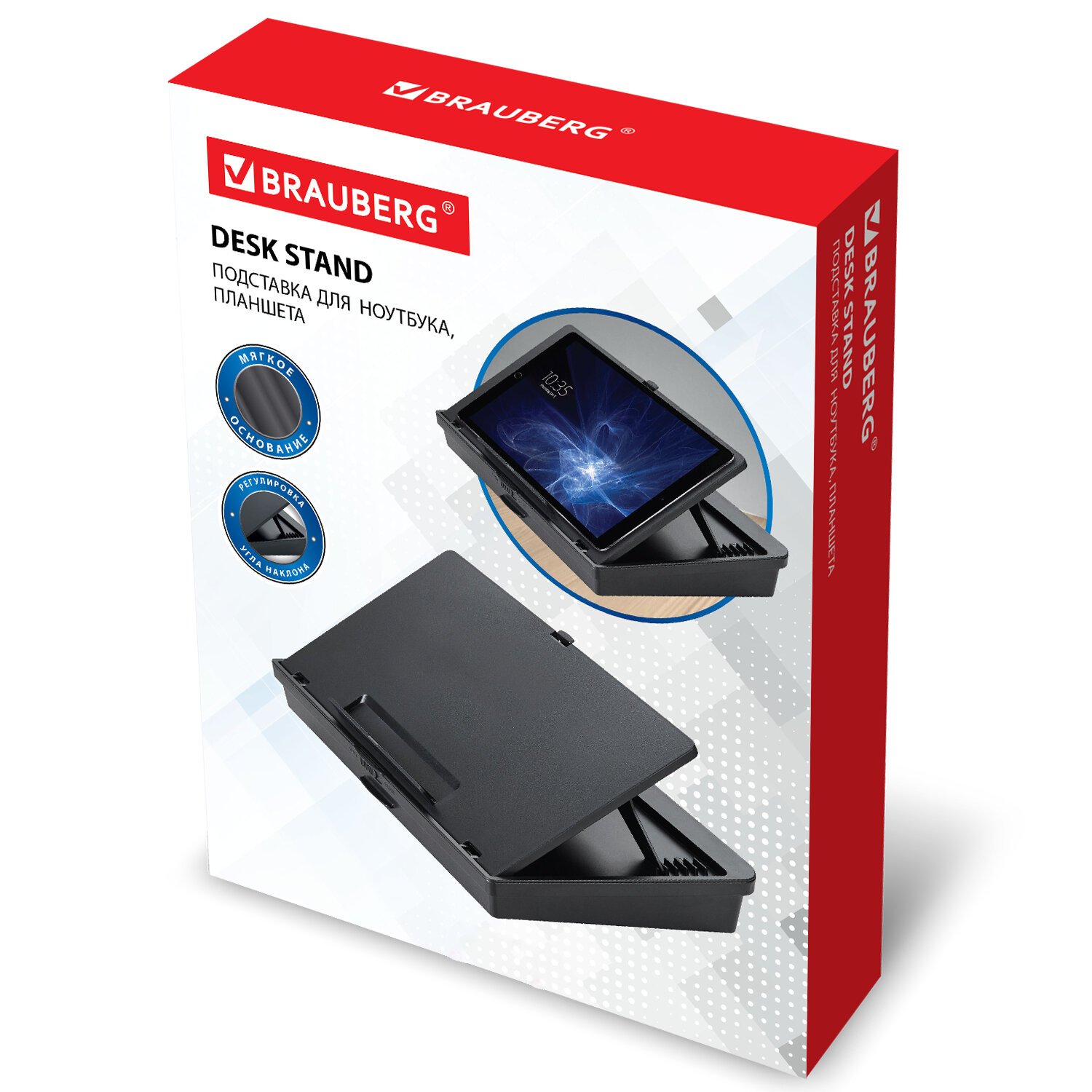 Подставка BRAUBERG позволяет с комфортом работать на ноутбуке, планшете и смартфоне, писать и заниматься творчеством в любом месте. Мягкое основание и регулирока угла наклона делает ее максимально комфортной в использовании.