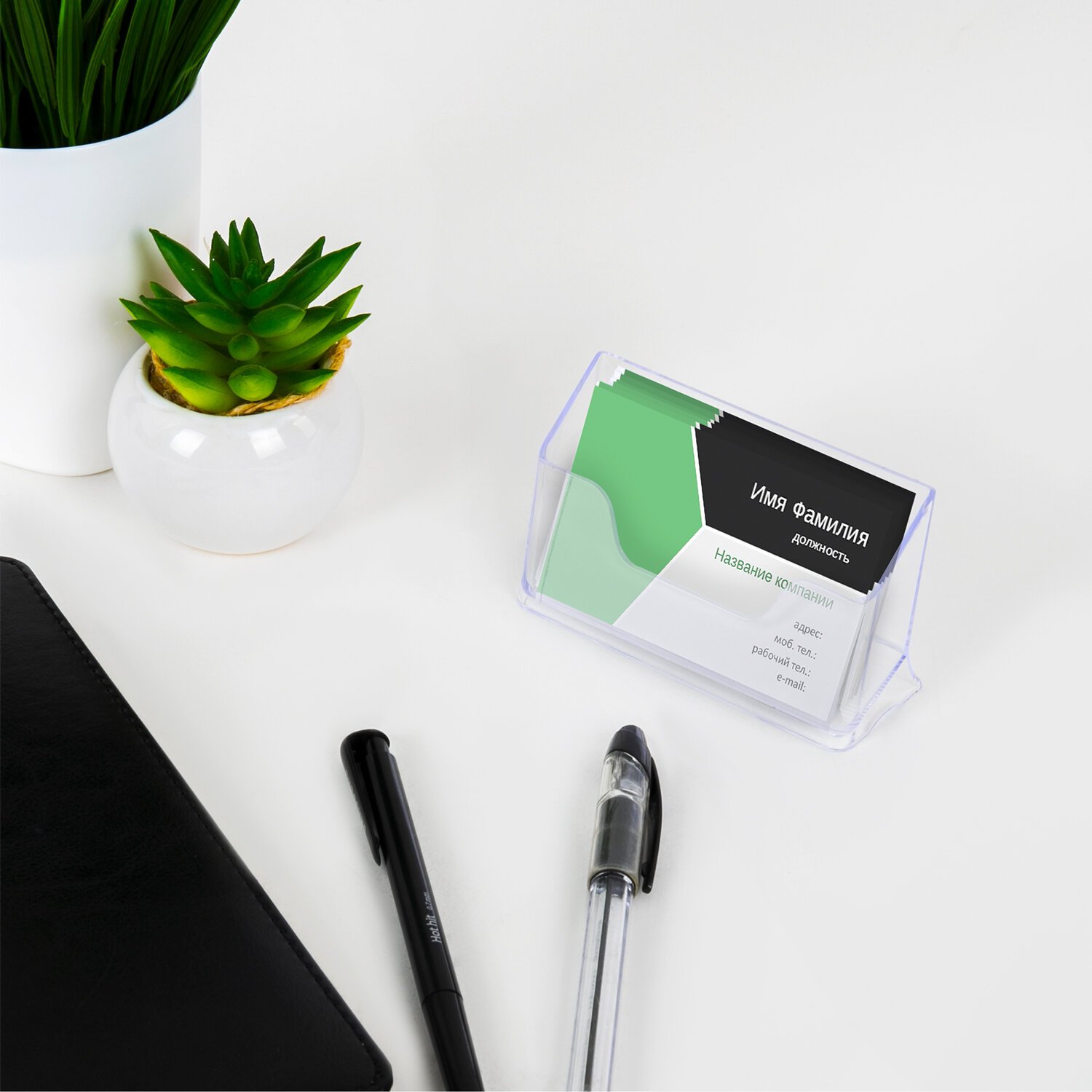 Изготовлена из прозрачного оргстекла. Имеет одно отделение, способное вместить 50 визиток шириной 90 мм. Размер - 40х100х65 мм. Поставляется в защитной пленке.
