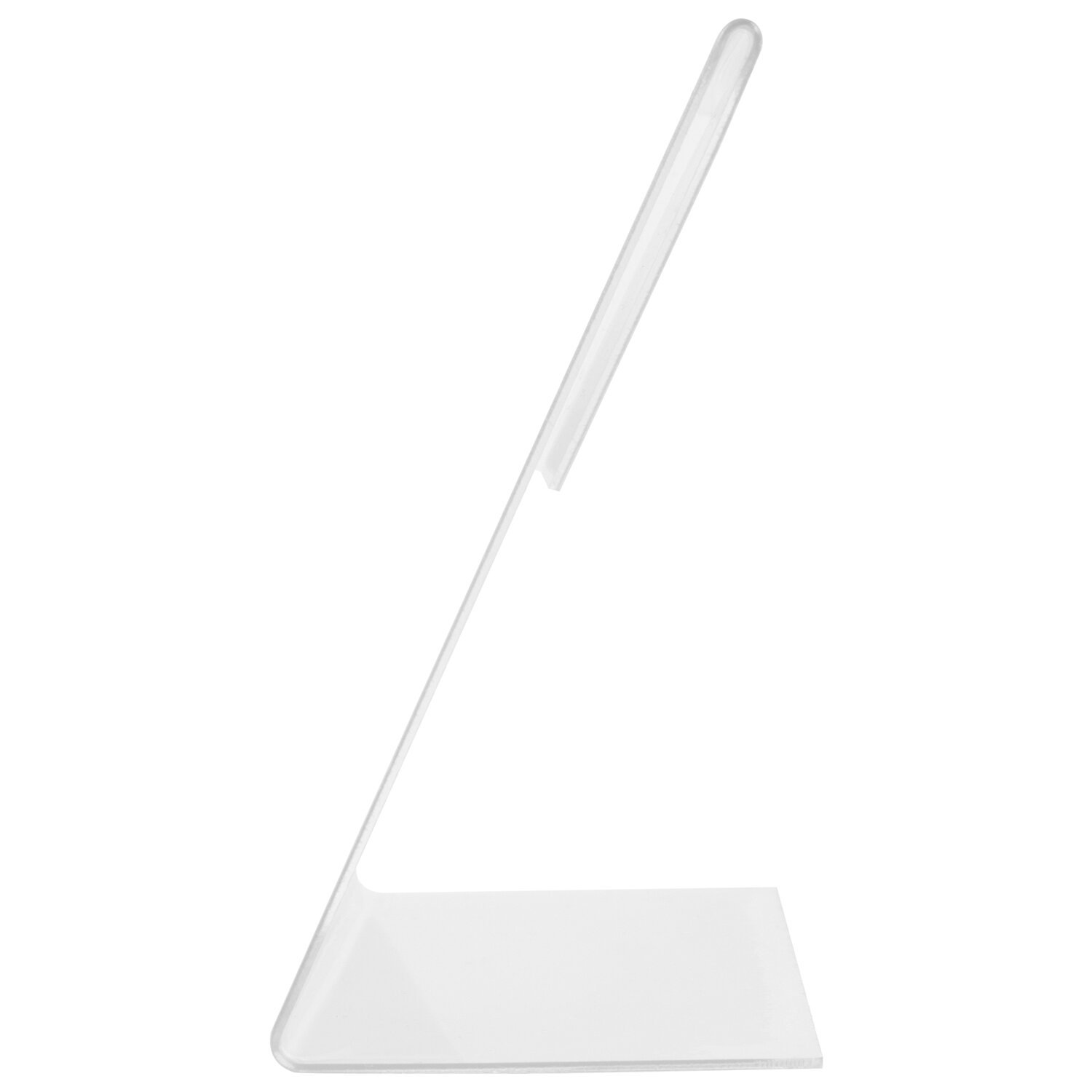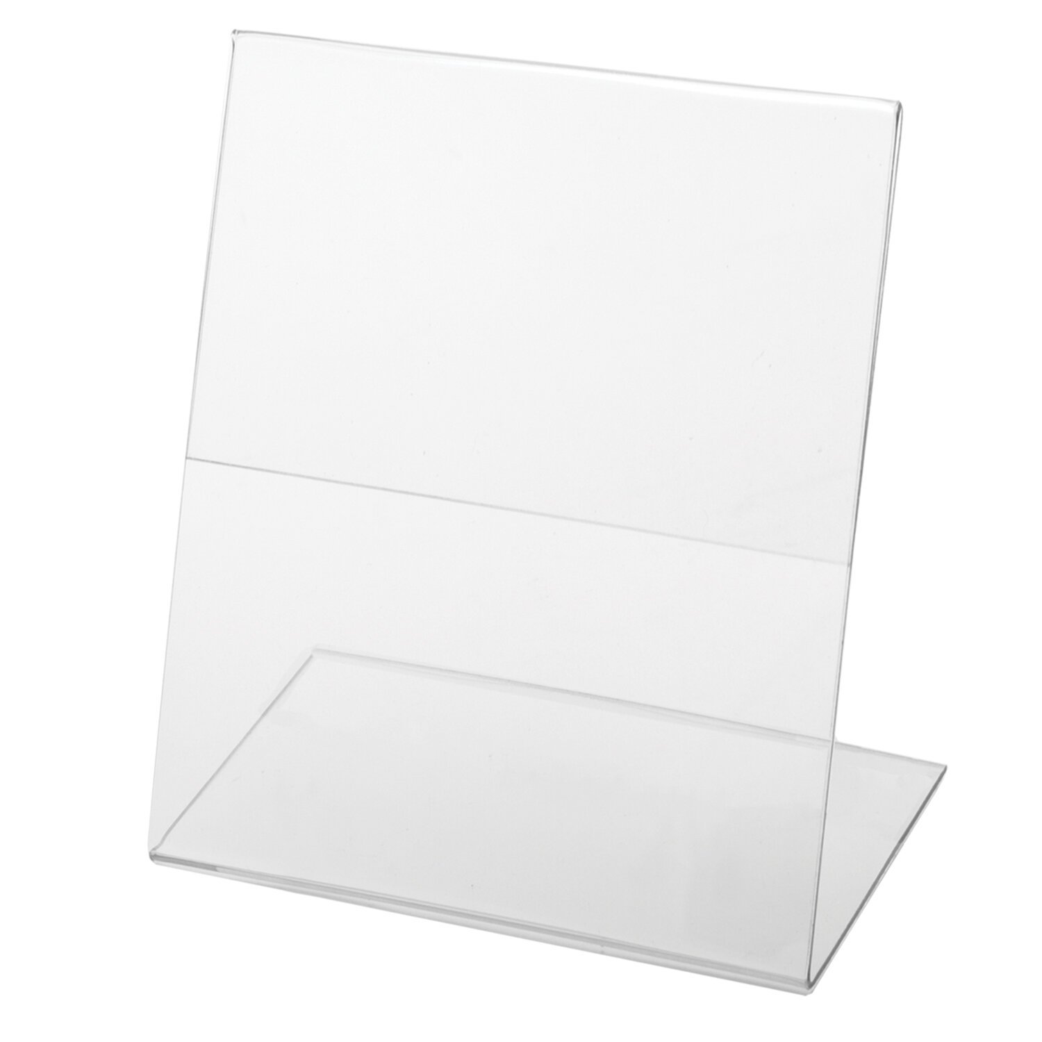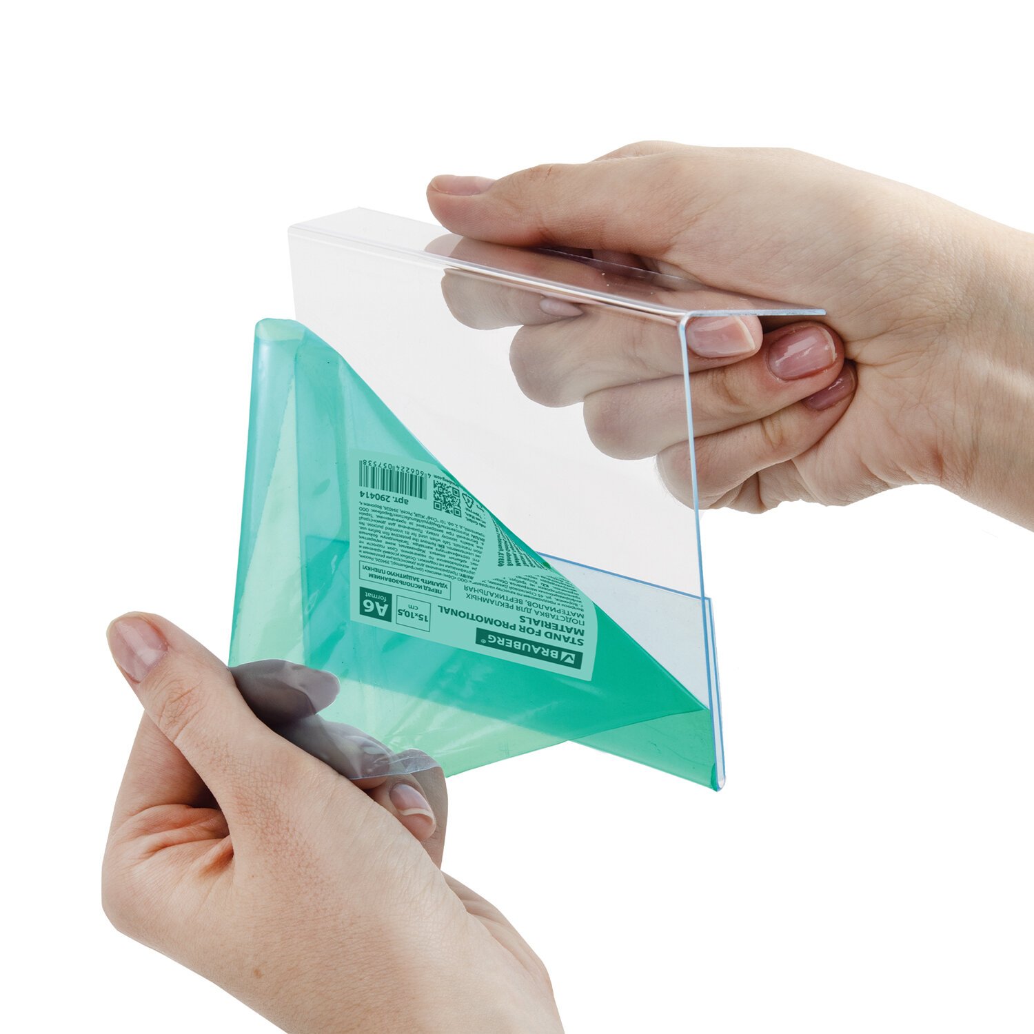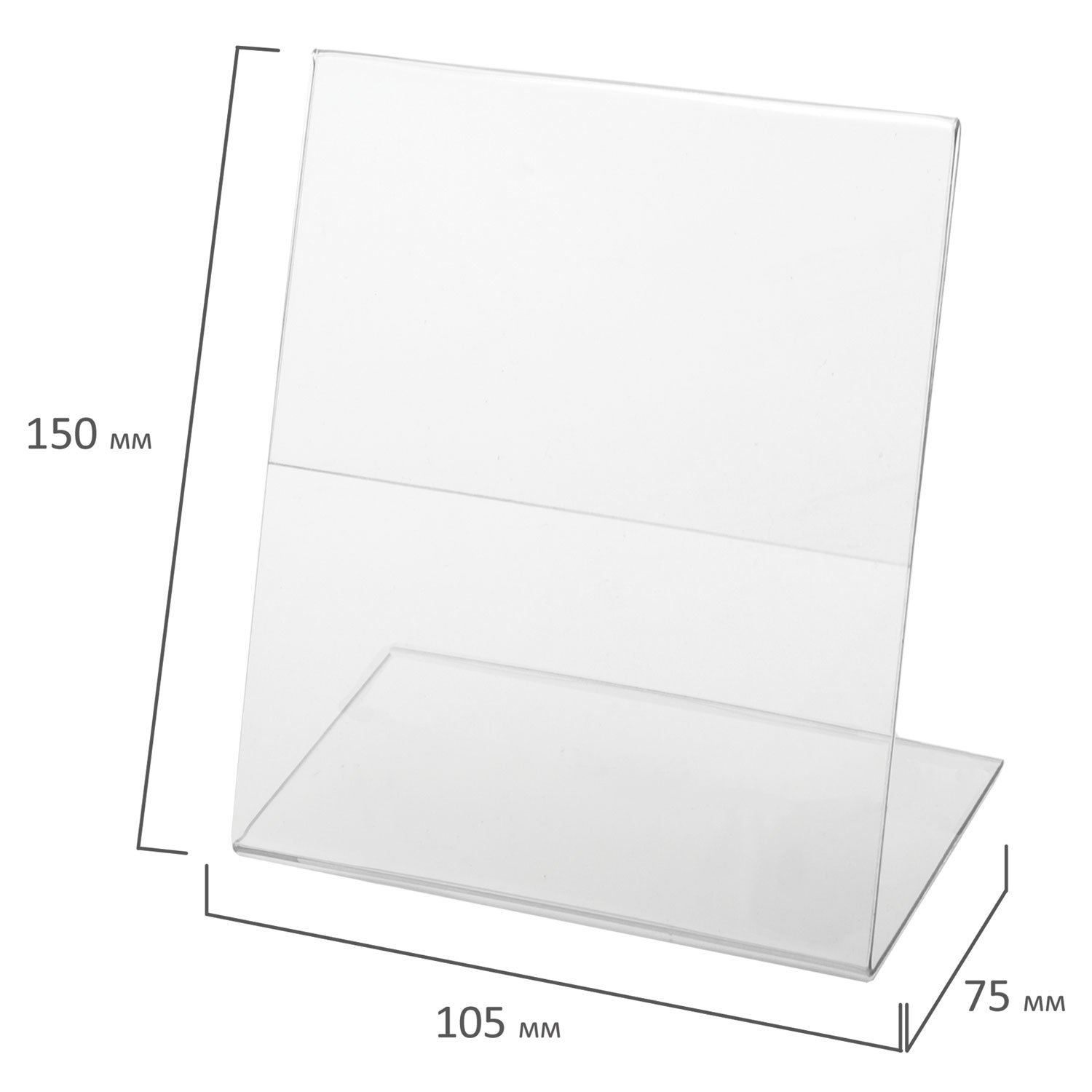 Устойчивая практичная конструкция изготовлена из прозрачного акрилового стекла толщиной 1 мм. Имеет размер 150х105 мм. Максимальная толщина вставки составляет 1,5 мм, глубина основания держателя информации - 75 мм, ширина ножки - 1 мм. Идеально подходит для формата А6.