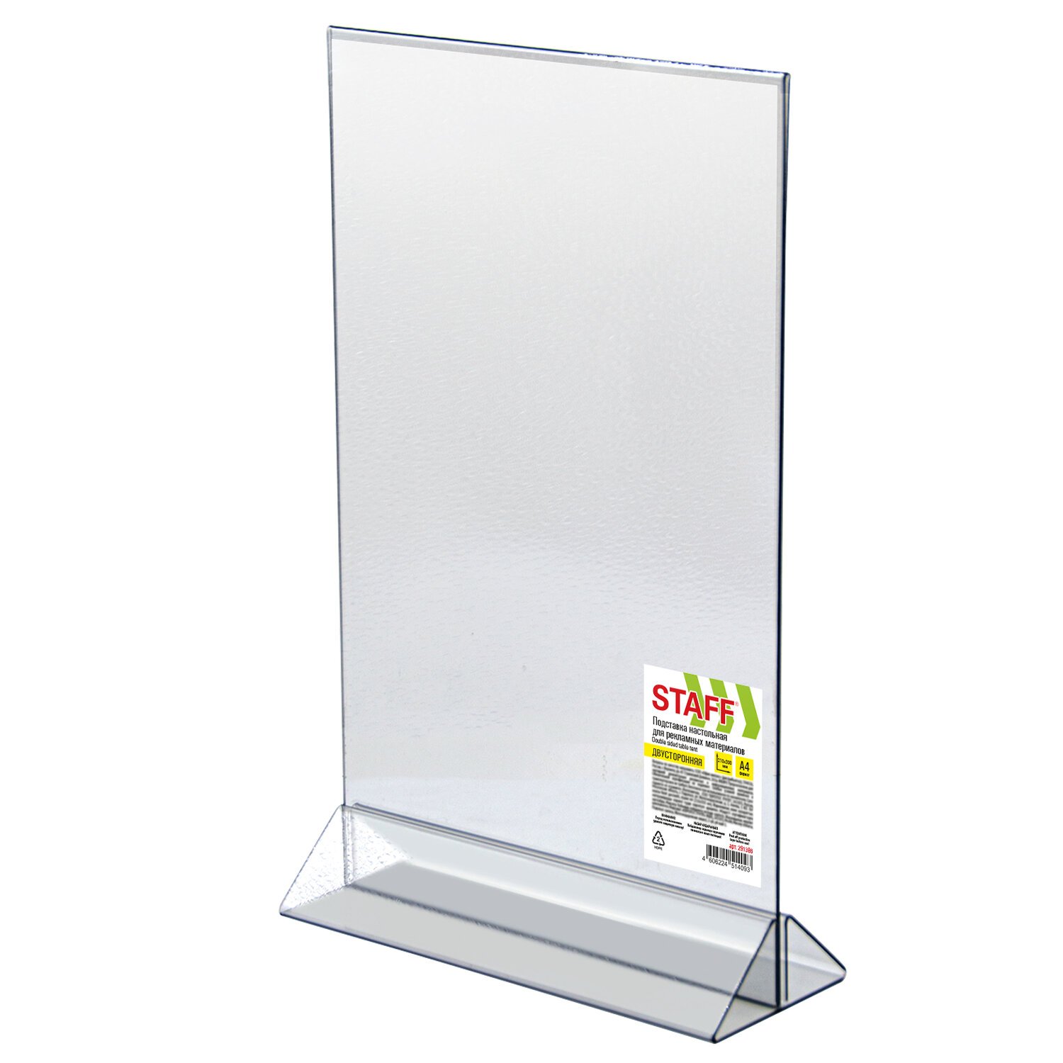 Подставка изготовлена из прозрачного ПЭТ. Предназначена для настольного вертикального размещения. Формат А4 и меньше. Максимальная высота вставляемого листа 300 мм, максимальная ширина вставляемого листа 210 мм. Упакована в термоусадочную пленку.