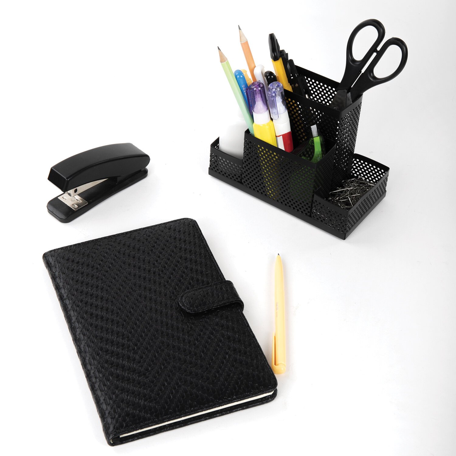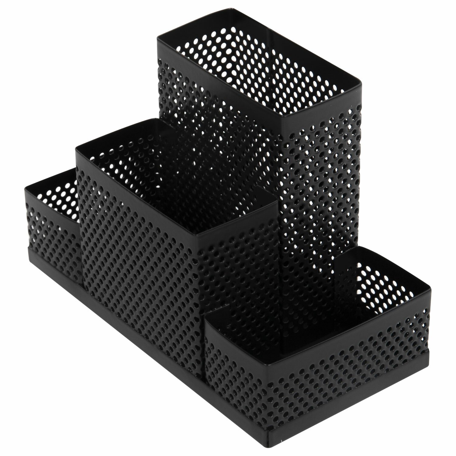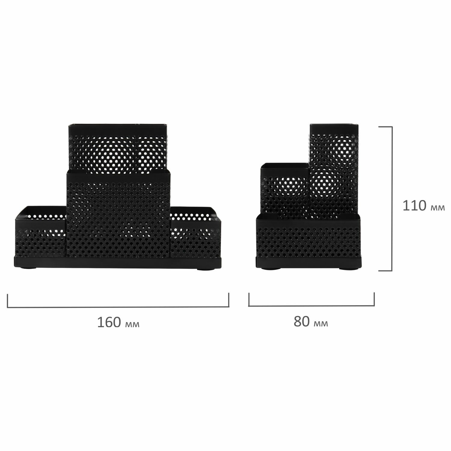 Изготовлена из металлической сетки. Имеет размеры 160х80х110 мм. Выполнена в черном цвете. Состоит из 4 секций, которые позволяют хранить и сортировать самые разные канцелярские принадлежности. Поставляется без канцелярского наполнения.