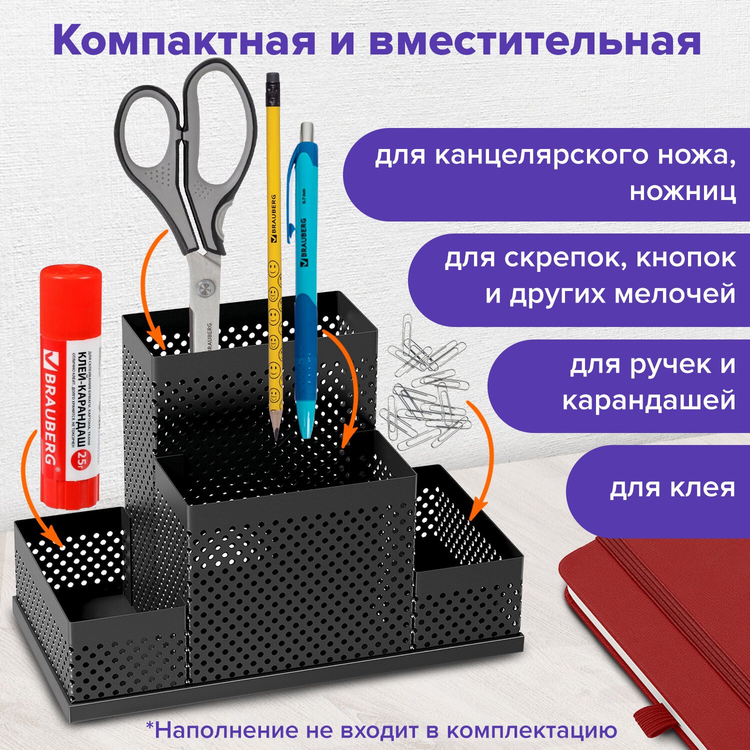 Практичная и долговечная металлическая подставка-органайзер BRAUBERG предназначена для хранения различных канцелярских и пишущих принадлежностей.