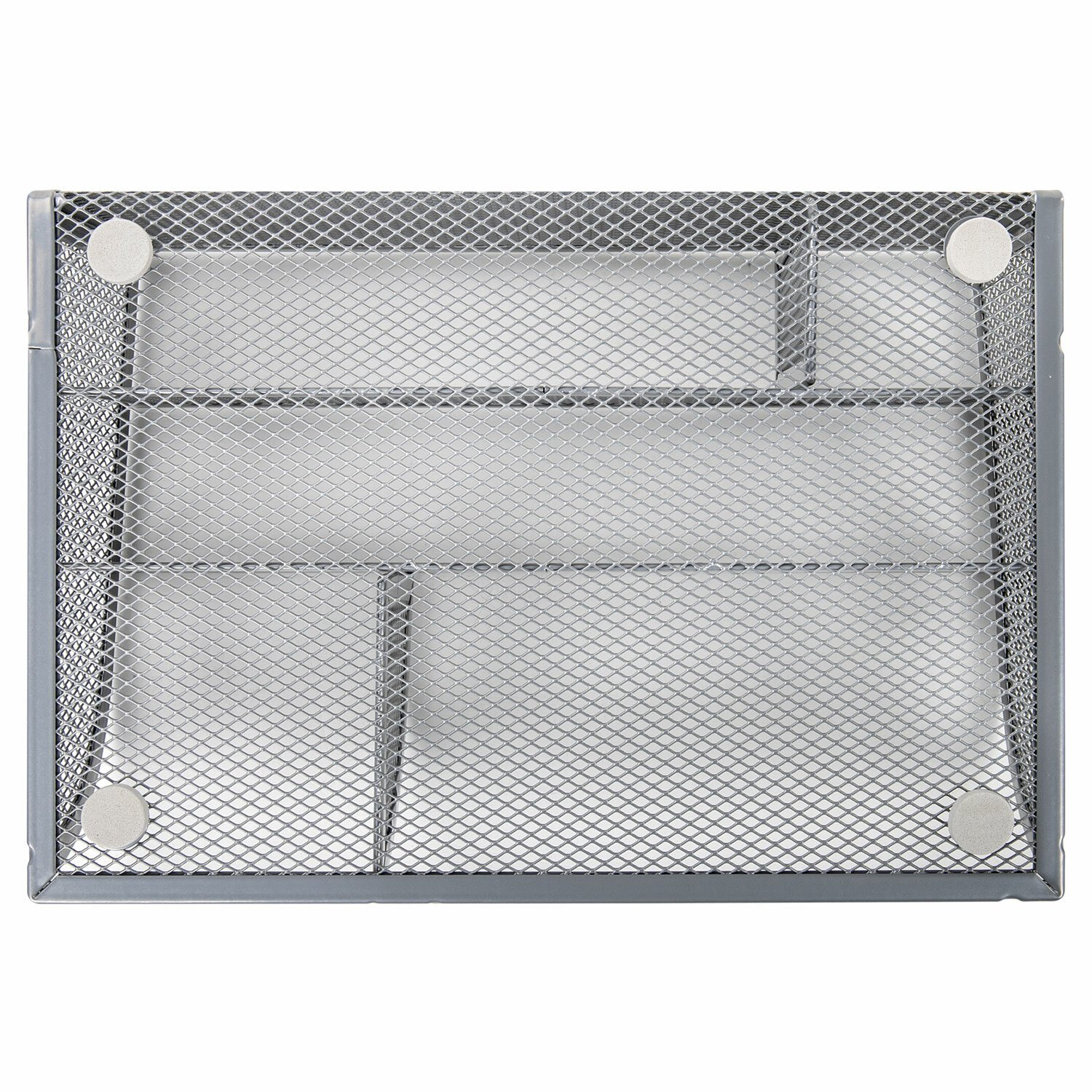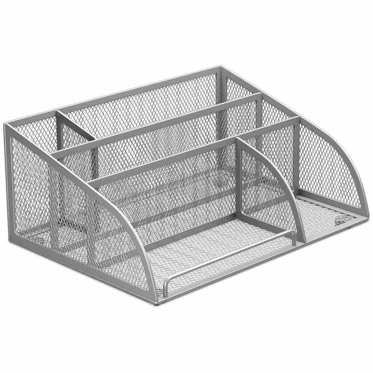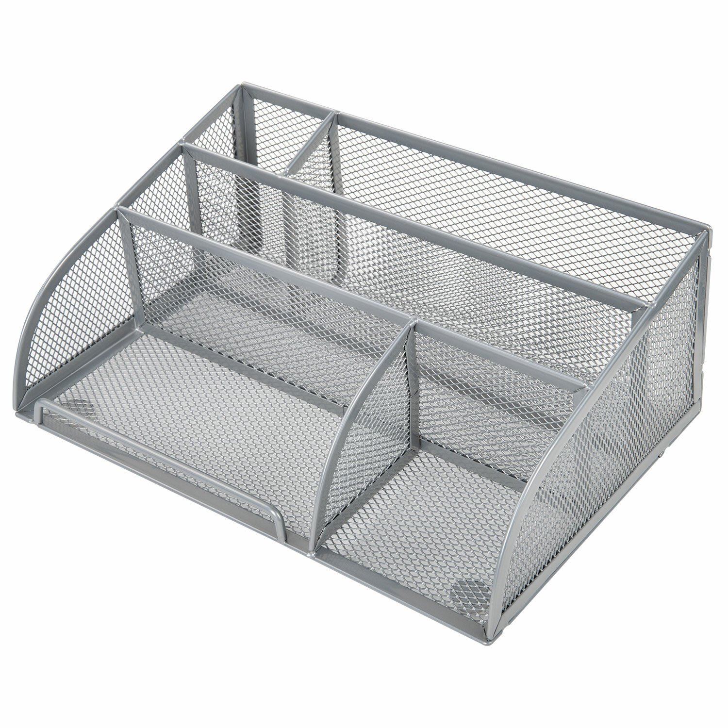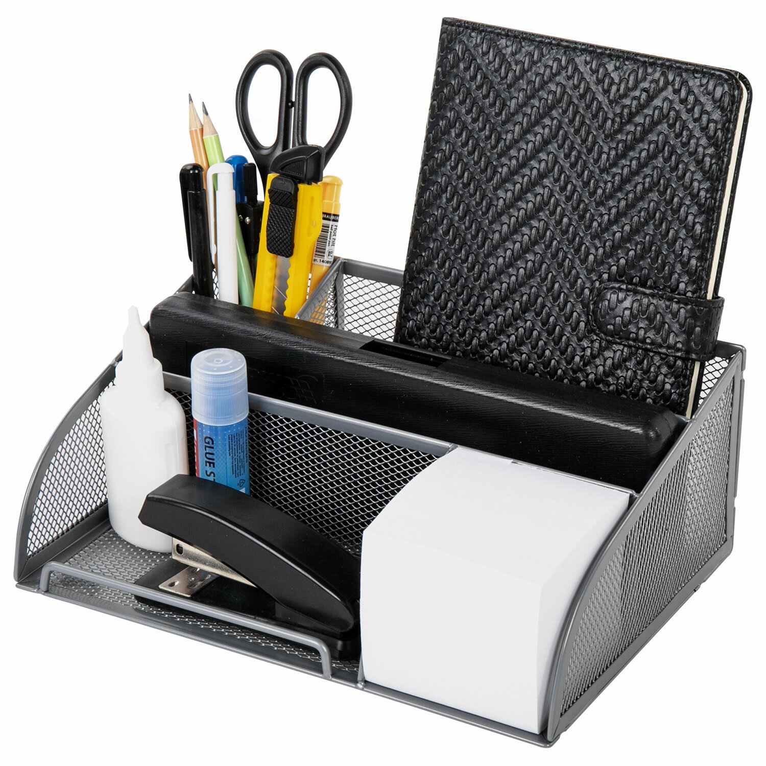 Изготовлена из металлической сетки. Имеет размеры 255х180х105 мм. Состоит из 5 отделений для пишущих принадлежностей и канцелярских мелочей. Мягкие подушечки на дне предотвращают скольжение и порчу мебели. Подставка-органайзер упакована в фирменную коробку. Поставляется без канцелярского наполнения.
