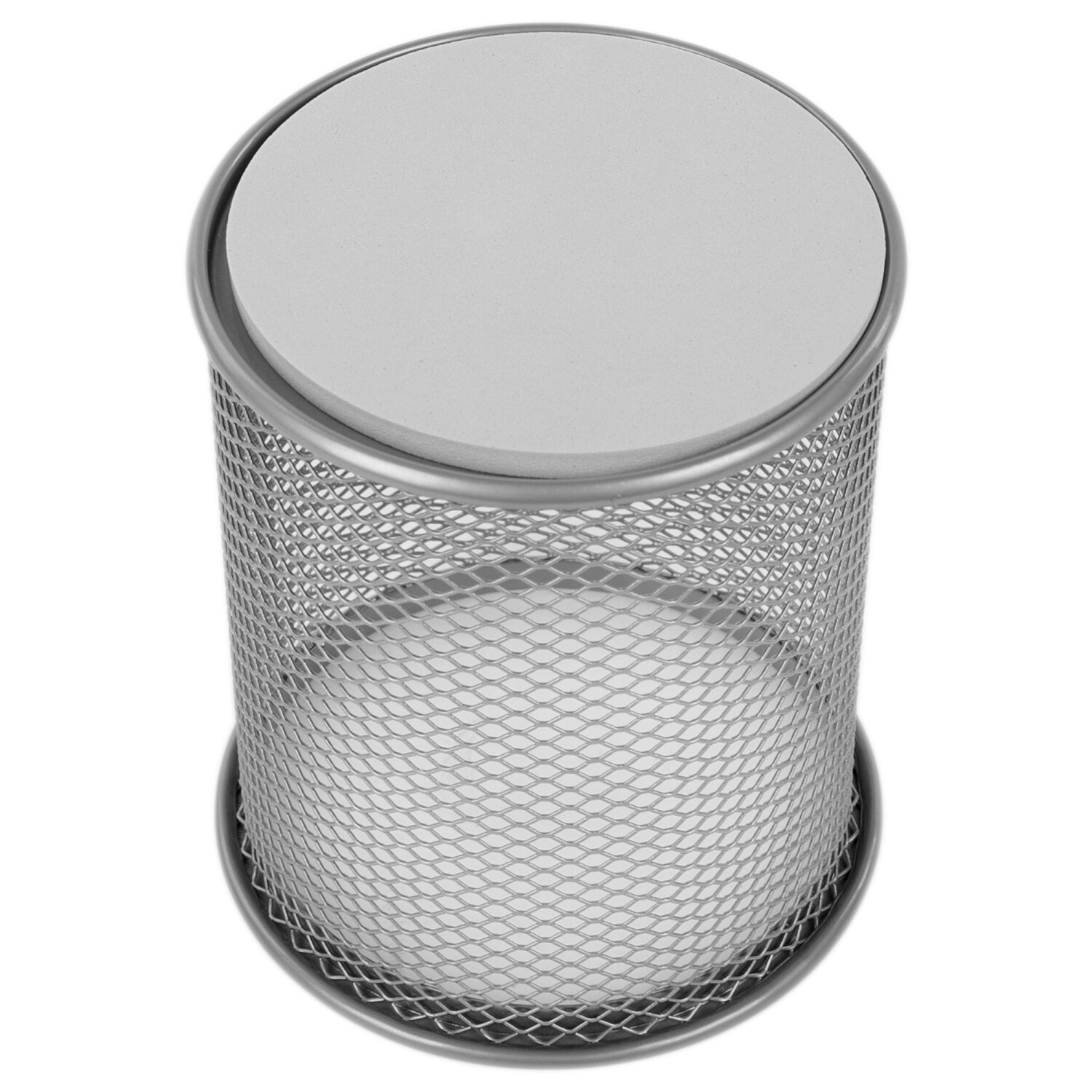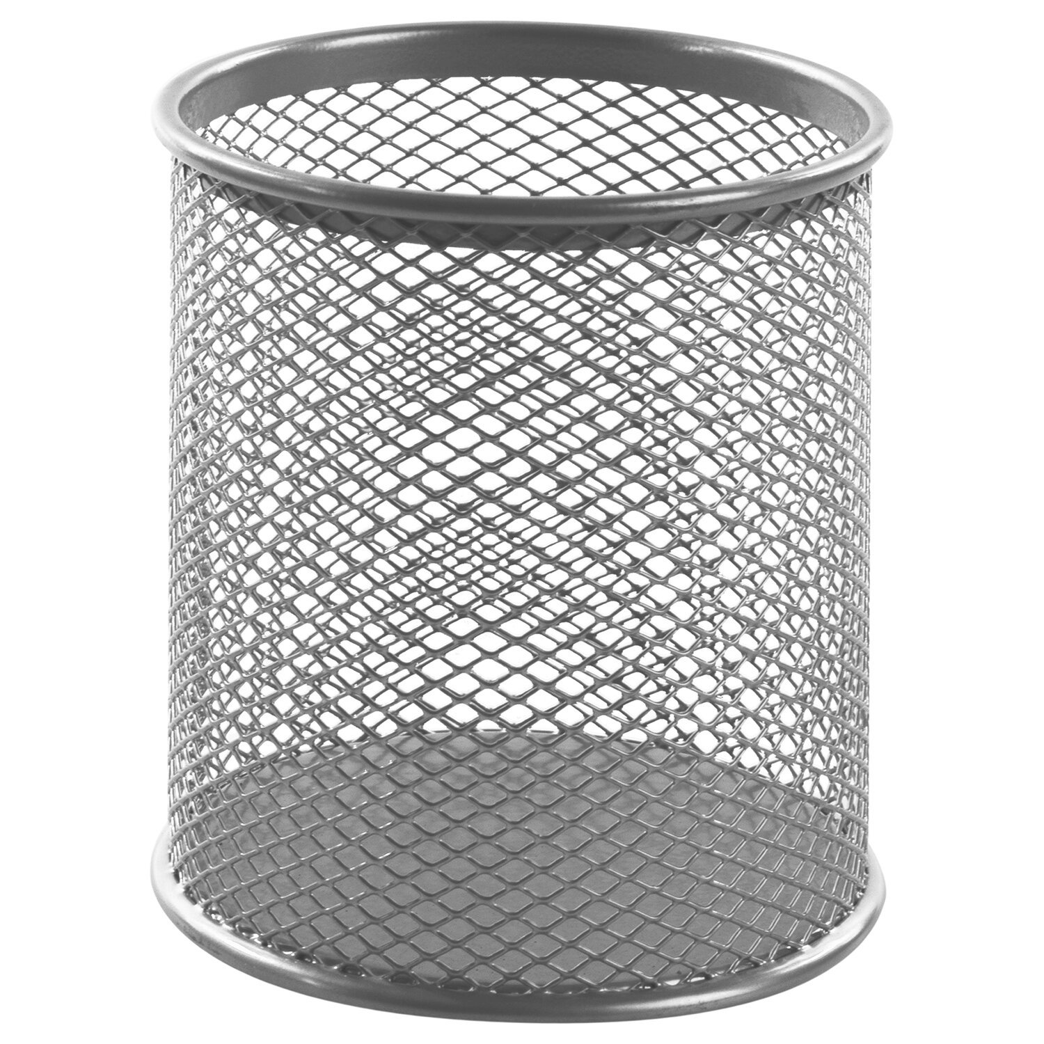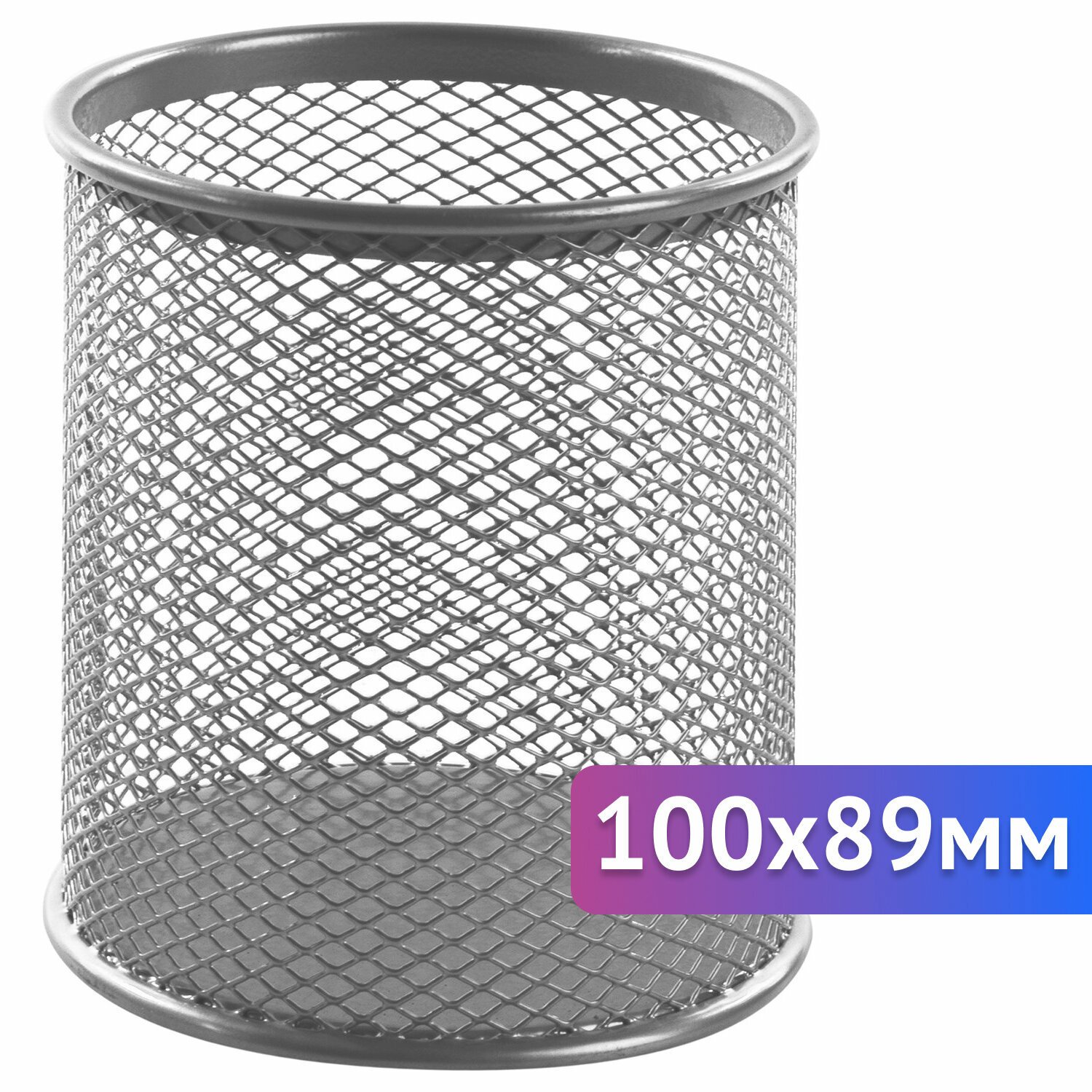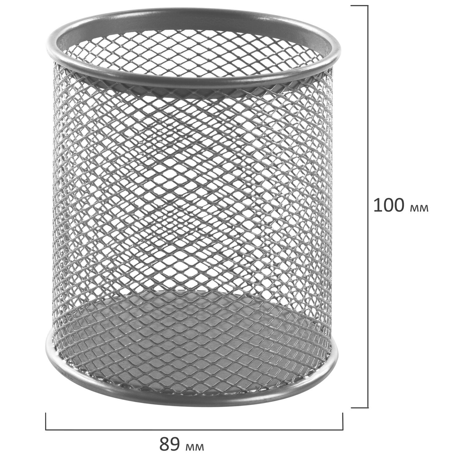 Изготовлена из металлической сетки. Имеет размеры 100х89х89 мм. Состоит из одного отделения. Мягкие подушечки на дне предотвращают скольжение и порчу мебели. Поставляется без канцелярского наполнения.