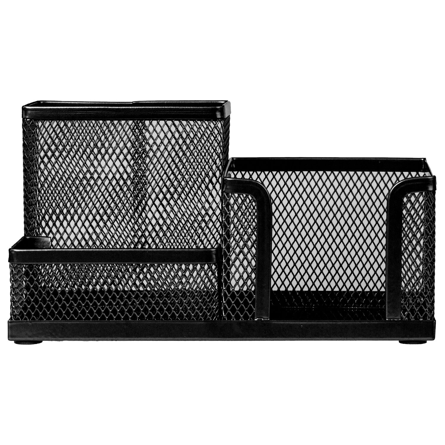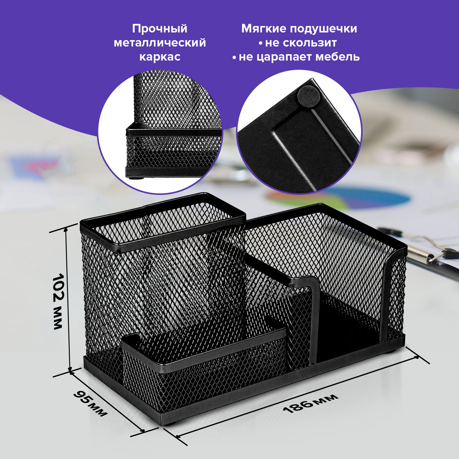 Изготовлена из металлической сетки. Имеет размеры 102х186х95 мм. Состоит из 3 отделений: одного для бумажного блока размером 90х90 мм и двух – для пишущих принадлежностей и канцелярских мелочей. Мягкие подушечки на дне предотвращают скольжение и порчу мебели. Подставка-органайзер упакована в фирменную коробку. Поставляется без канцелярского наполнения.