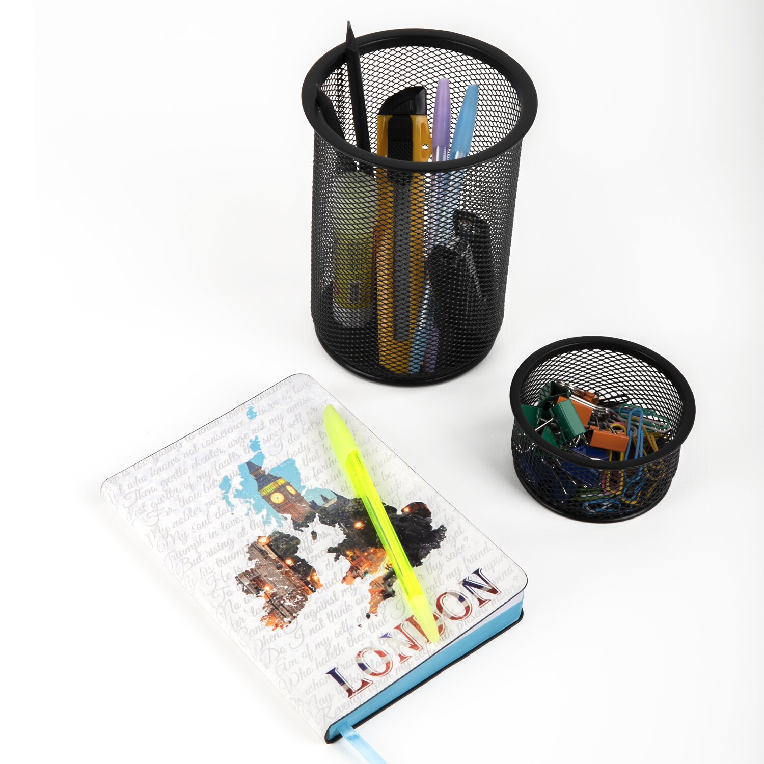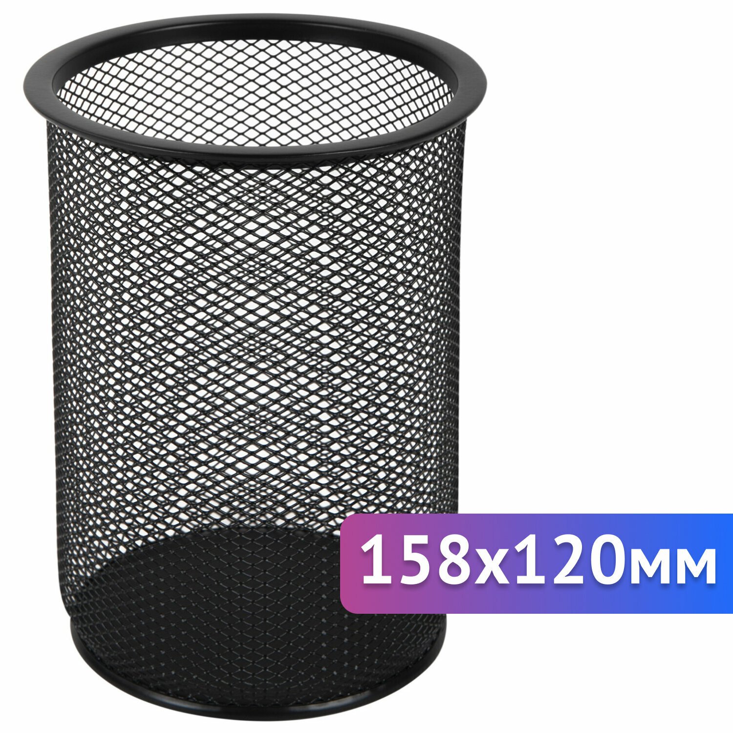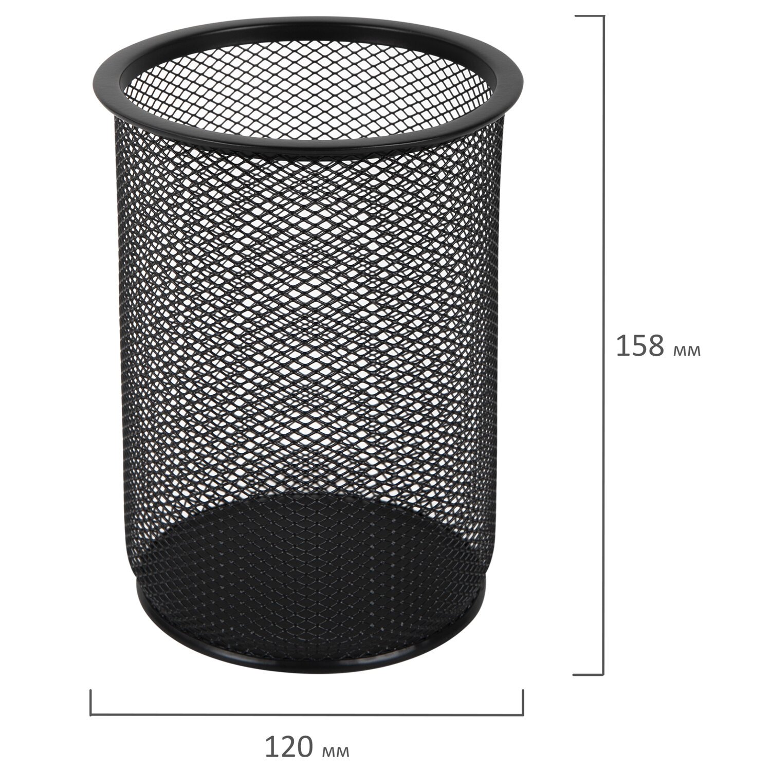 Изготовлена из металлической сетки. Имеет размеры 158х120х120 мм. Состоит из одного отделения. Мягкие подушечки на дне предотвращают скольжение и порчу мебели. Поставляется без канцелярского наполнения.