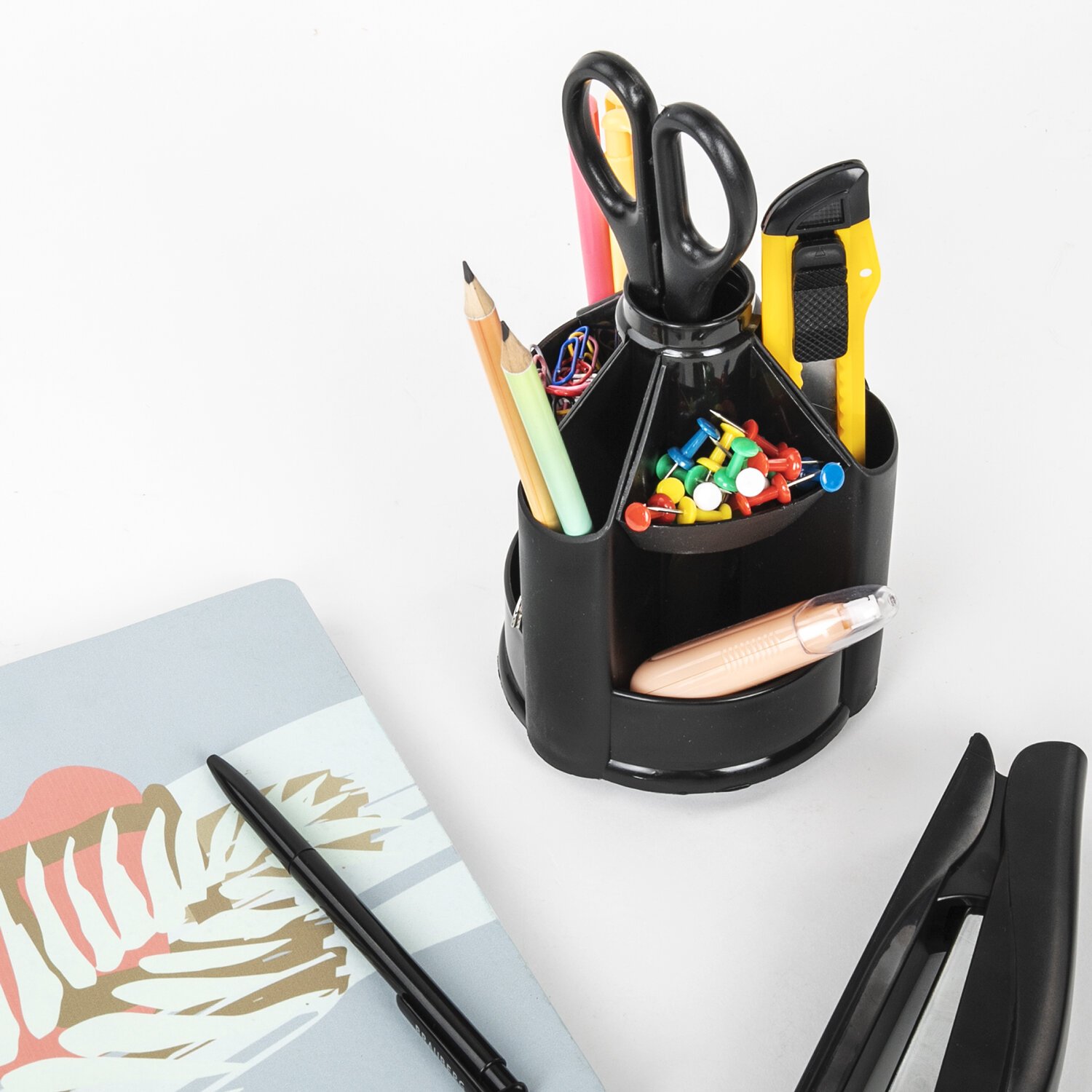Эргономичная пластиковая подставка-органайзер с 10 отделениями для пишущих принадлежностей и канцелярских мелочей имеет размер 107х107х130 мм. Легкое вращение на 360°. Поставляется без канцелярского наполнения.