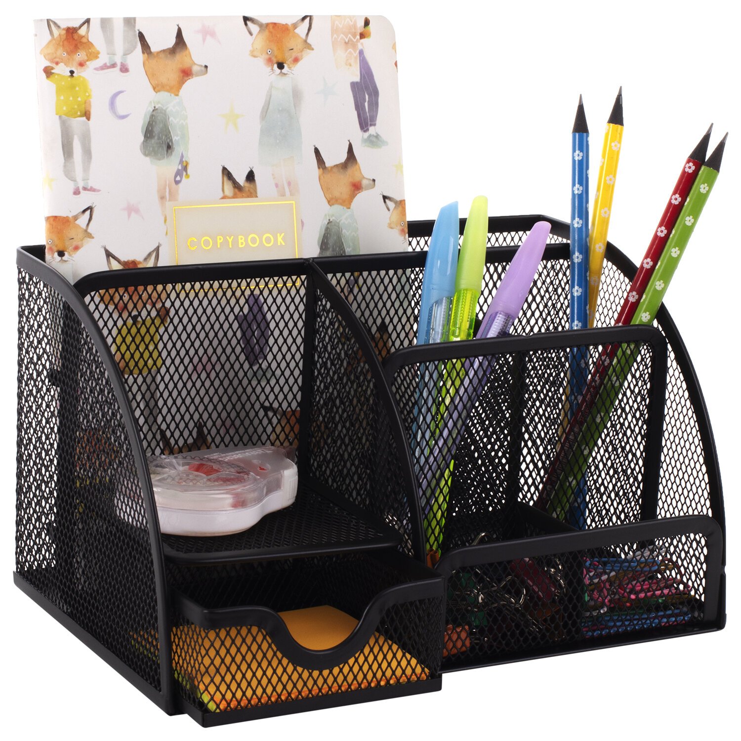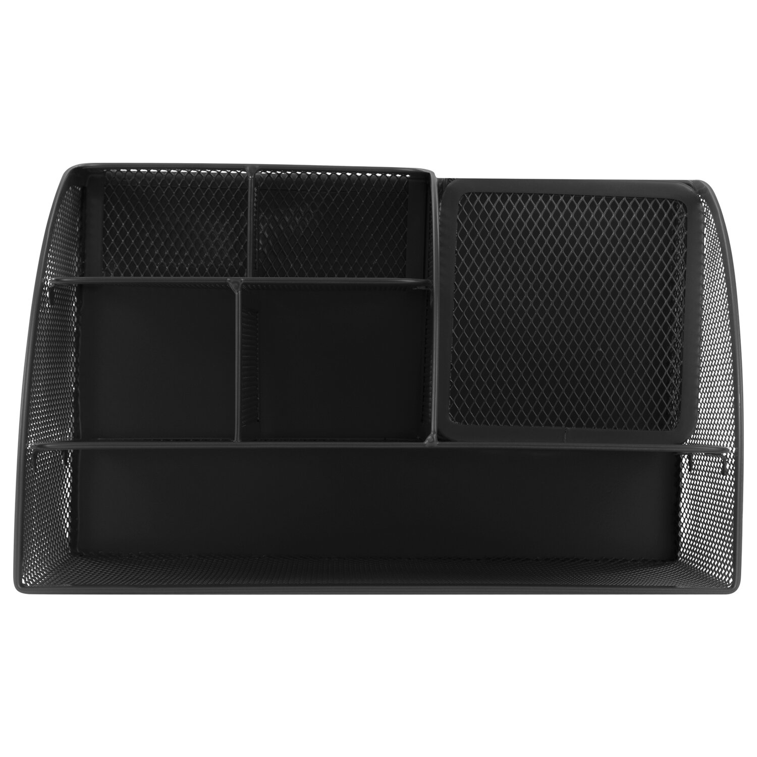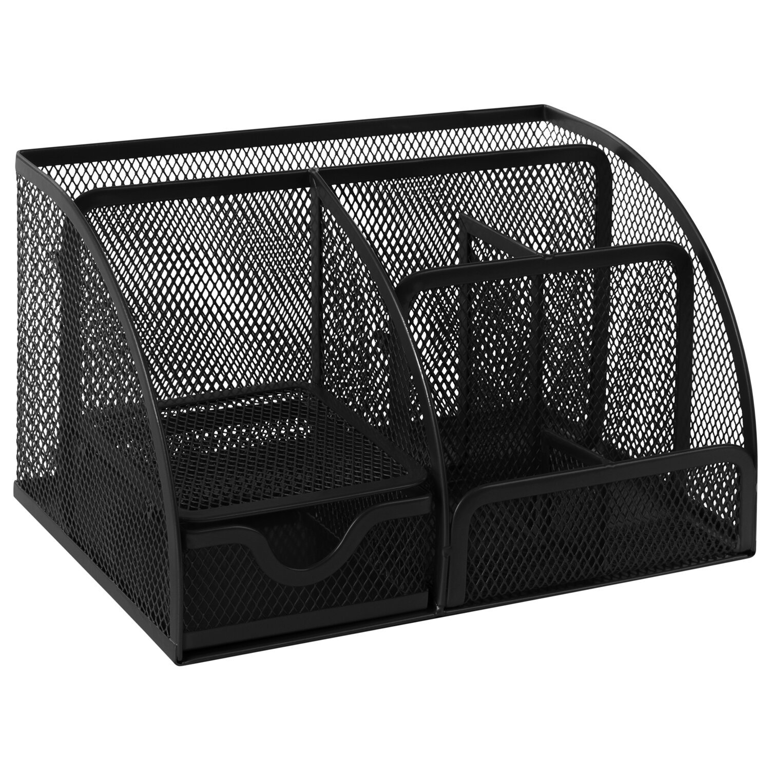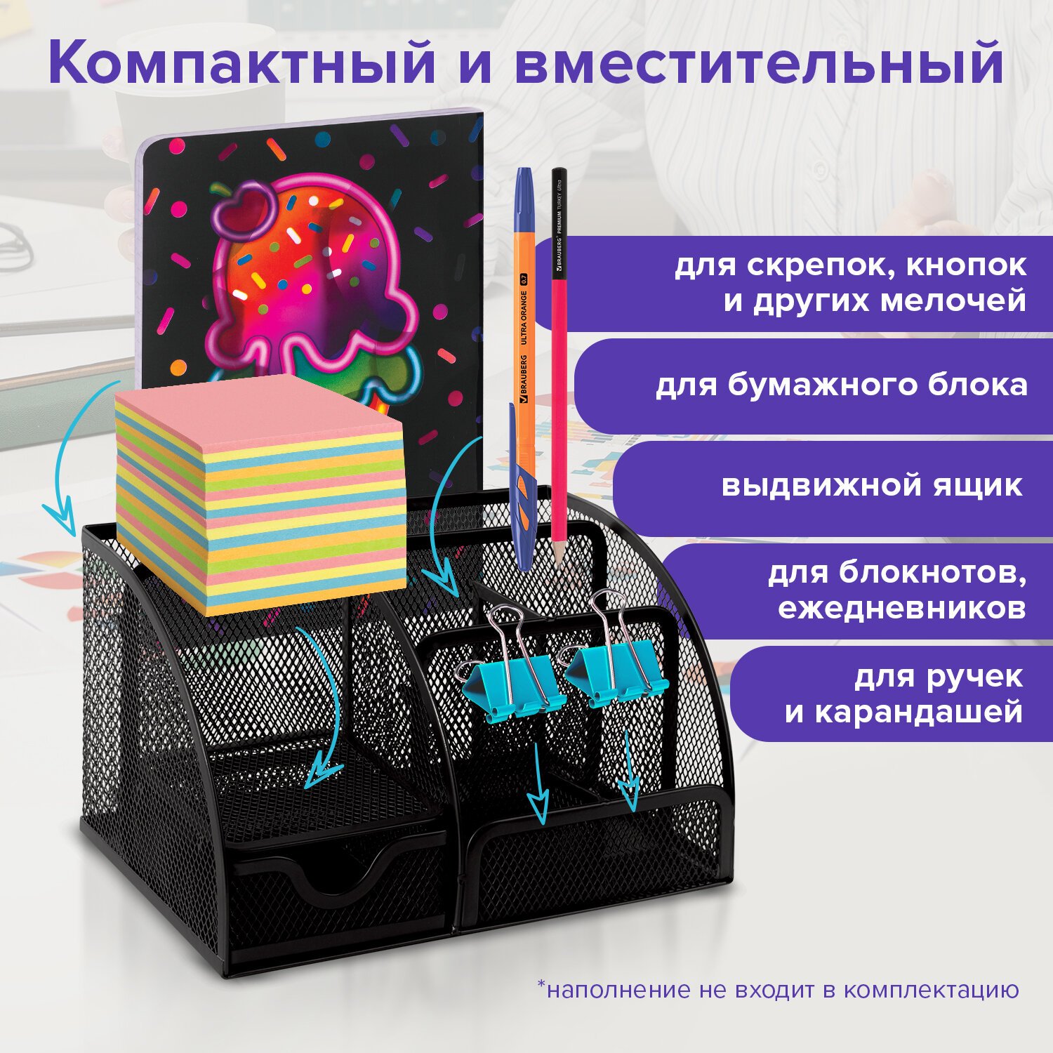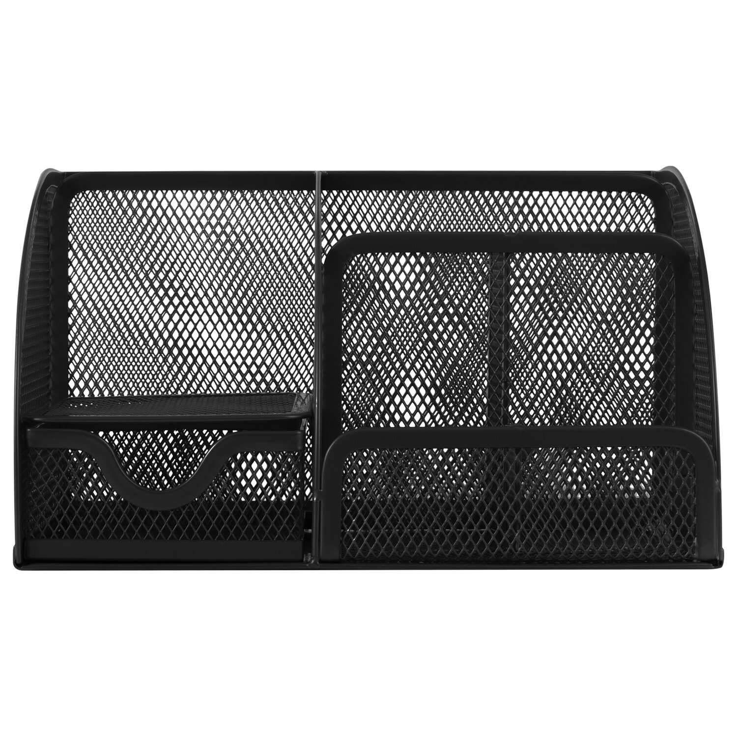 Изготовлена из металлической сетки. Имеет размеры 125х220х140 мм. Выполнена в черном цвете. Состоит из 7 секций, которые позволяют хранить и сортировать самые разные канцелярские принадлежности: от блоков для записей и кнопок – до ручек и карандашей. Мягкие подушечки на дне предотвращают скольжение и порчу мебели. Поставляется без канцелярского наполнения.