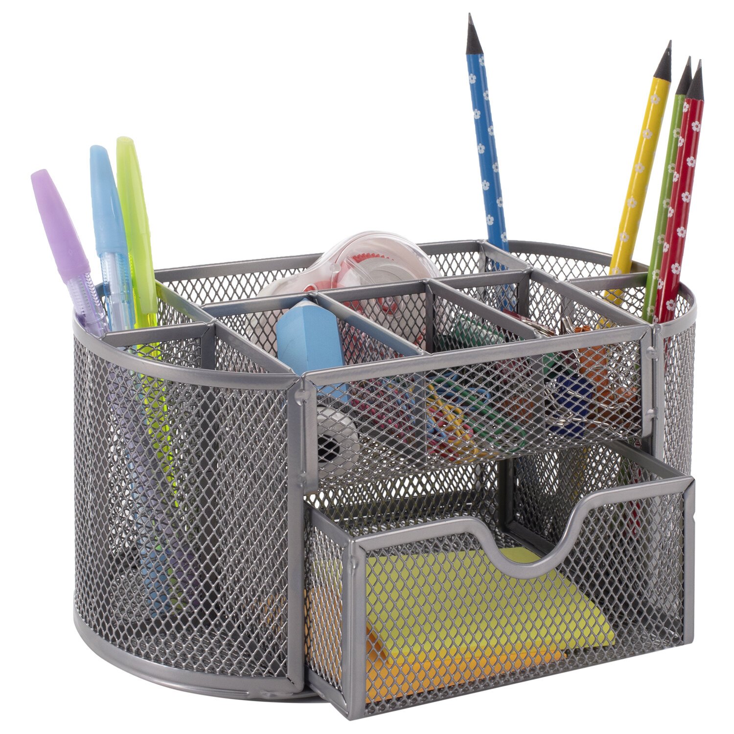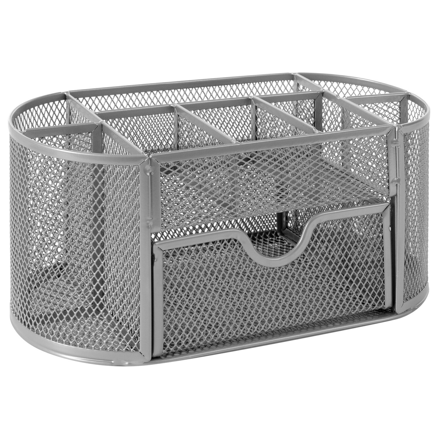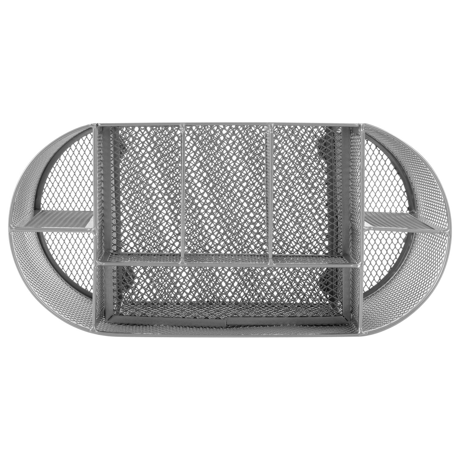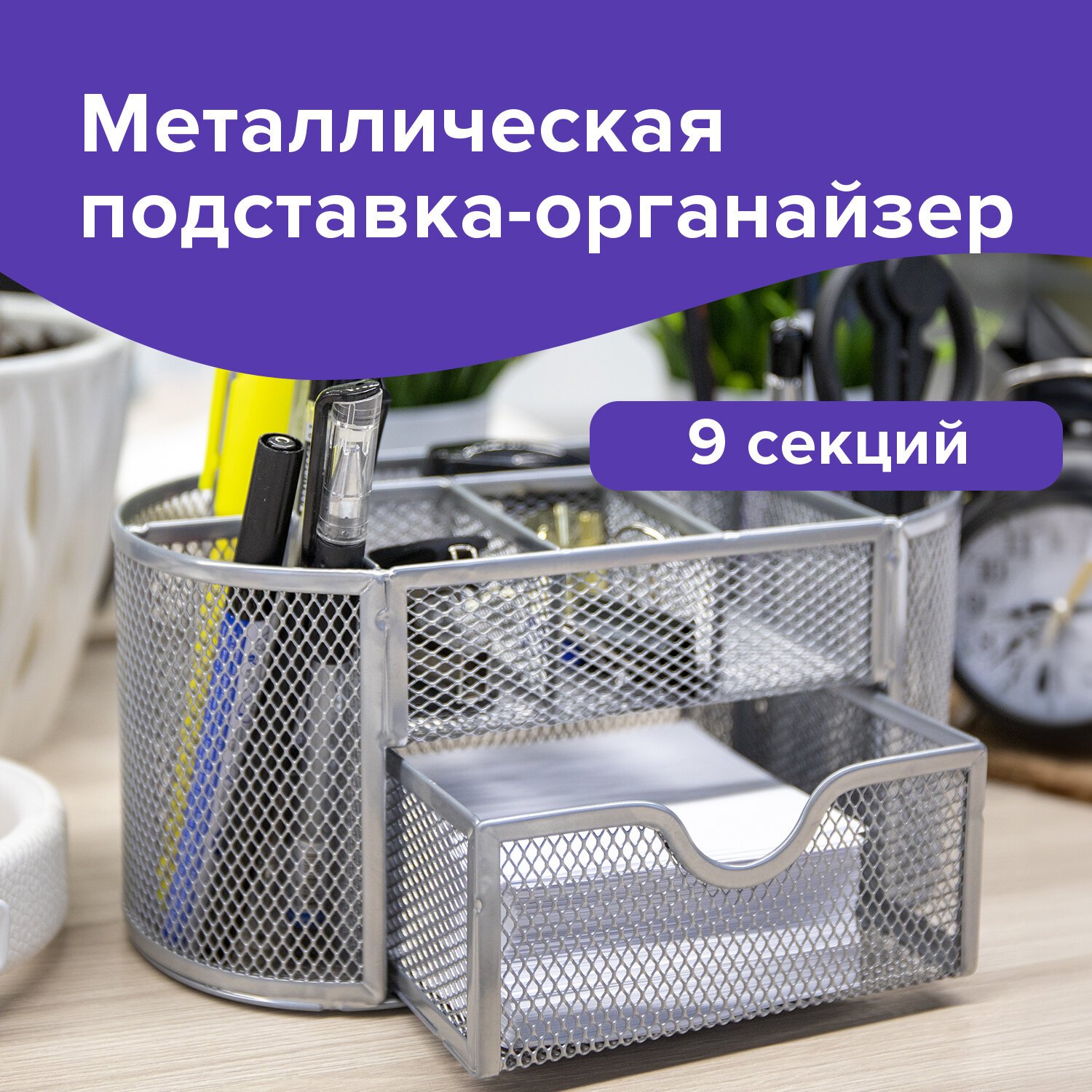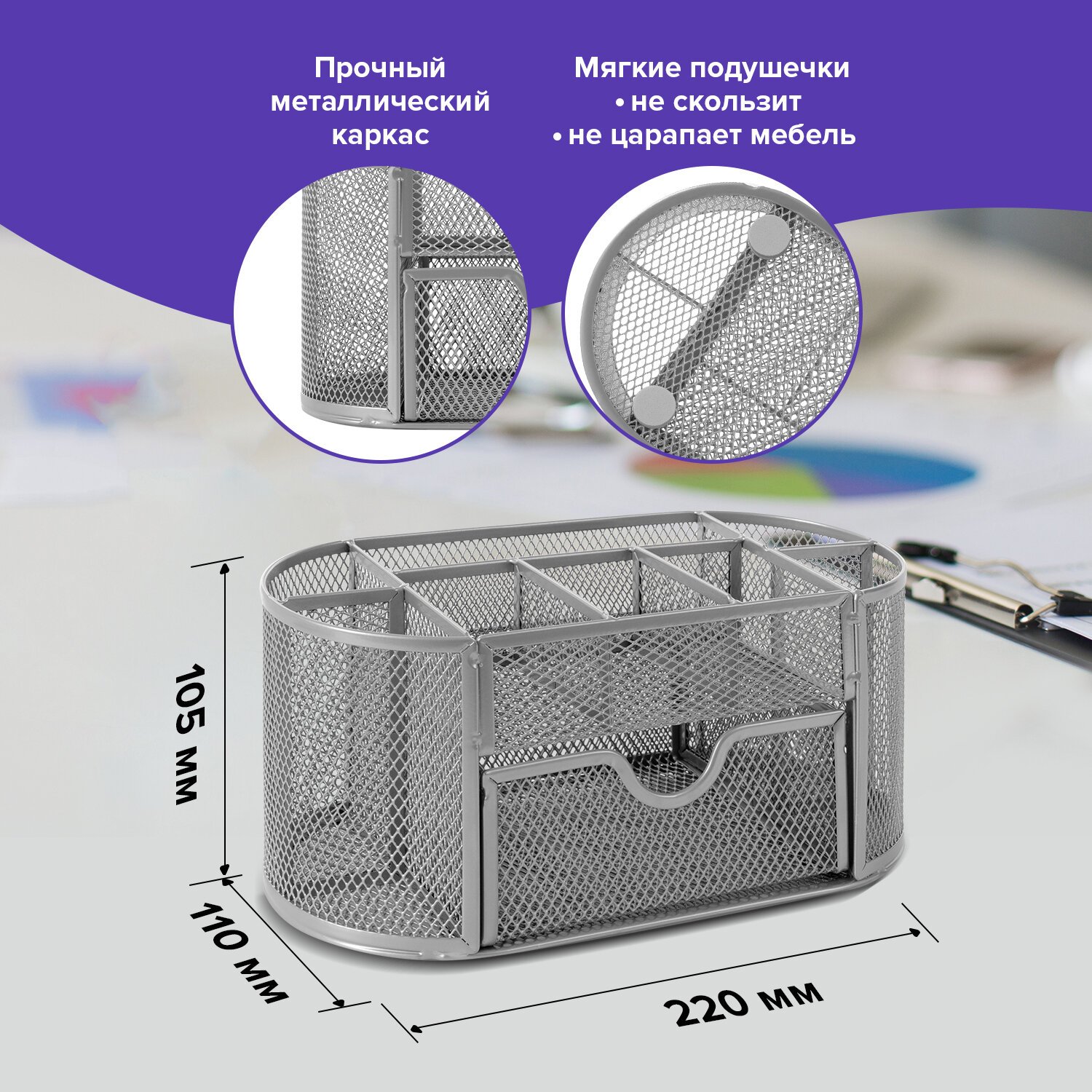 Изготовлена из металлической сетки. Имеет размеры 105х220х110 мм. Выполнена в серебристом цвете. Состоит из 9 секций, которые позволяют хранить и сортировать самые разные канцелярские принадлежности: от блоков для записей и кнопок – до ручек и текстовыделителей. Мягкие подушечки на дне предотвращают скольжение и порчу мебели. Поставляется без канцелярского наполнения.