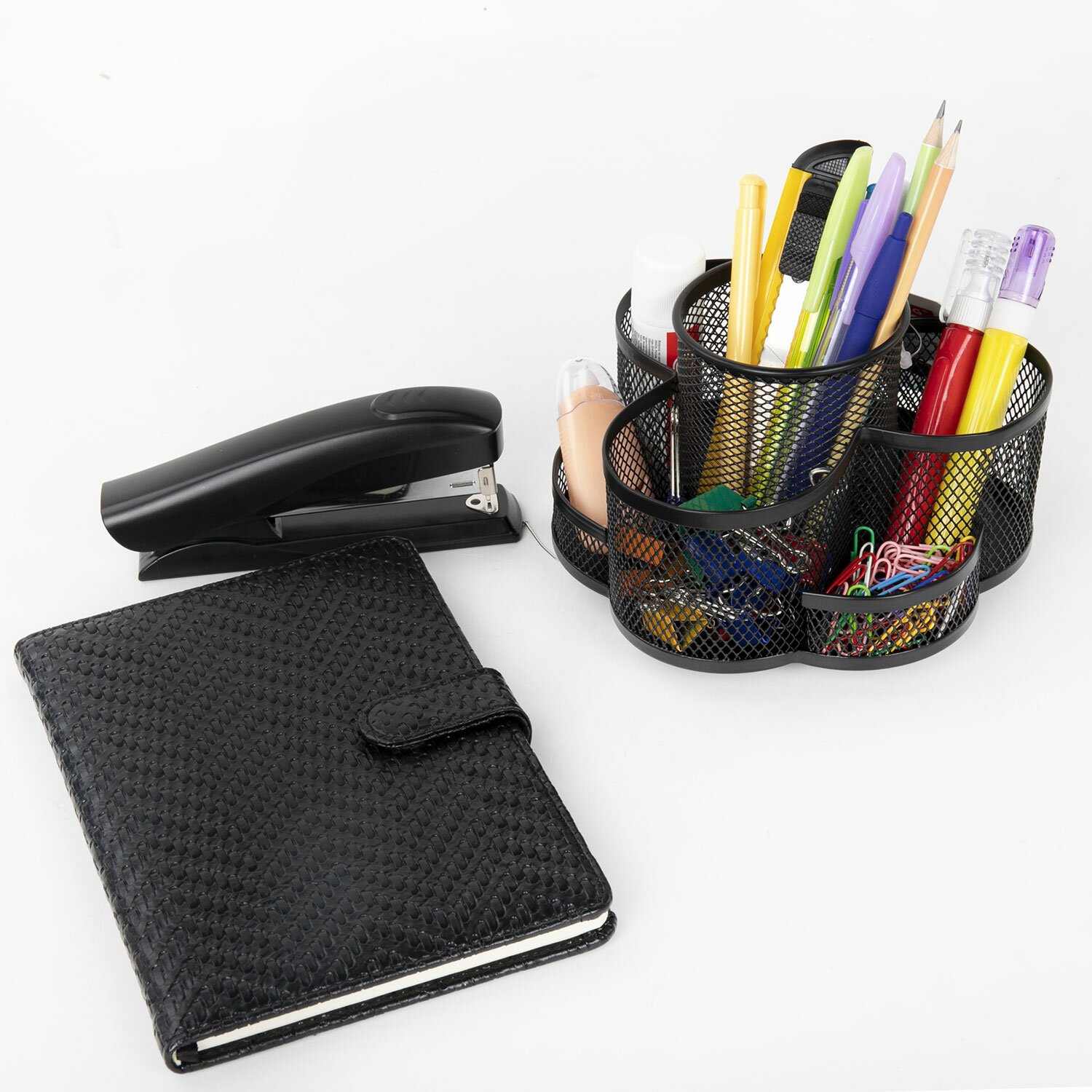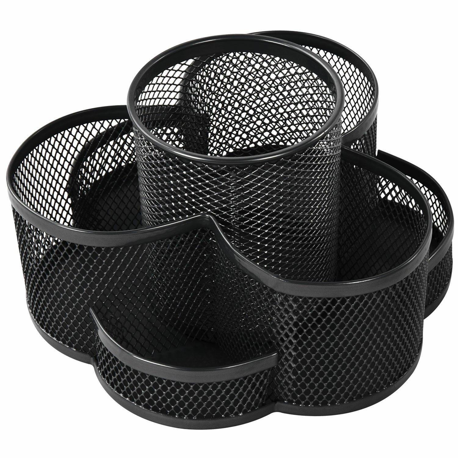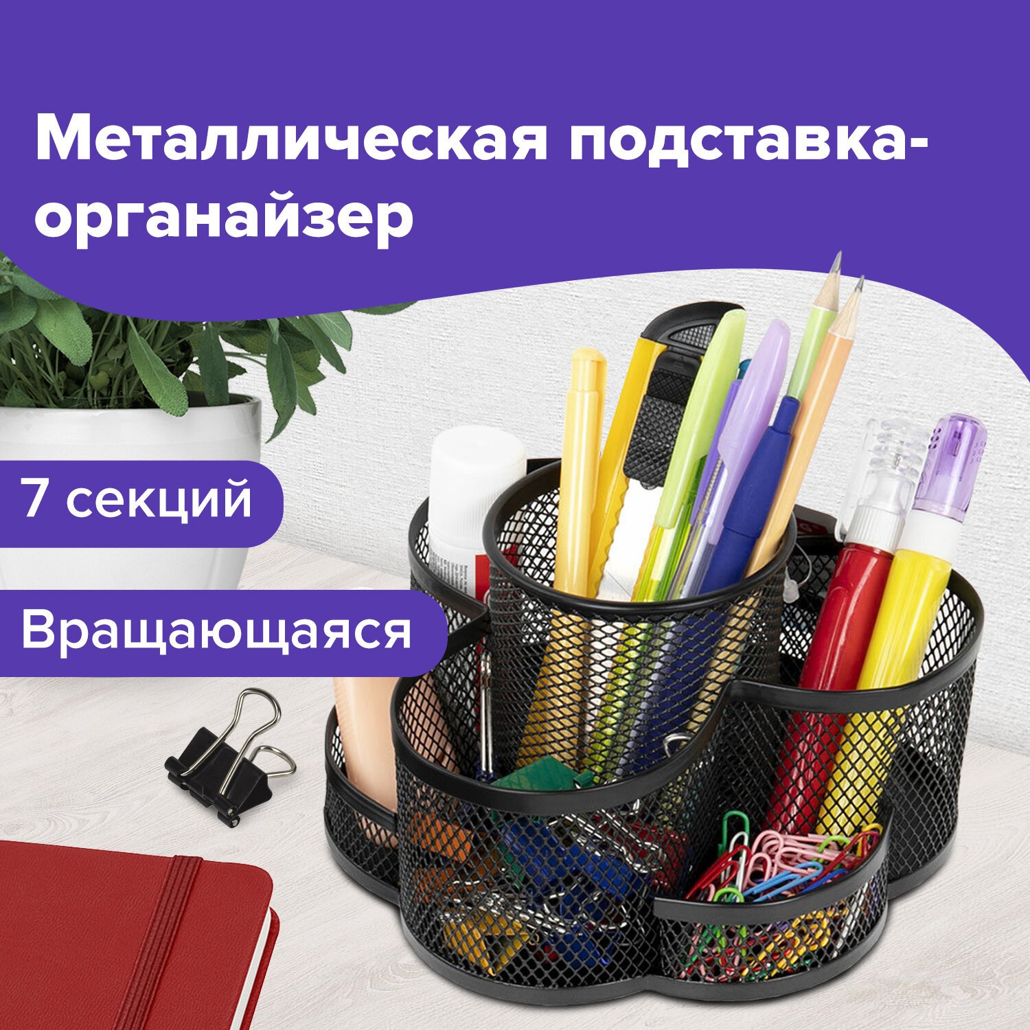 Изготовлена из металлической сетки. Имеет размеры 110х165х175 мм. Выполнена в черном цвете. Состоит из 7 секций, которые позволяют хранить и сортировать самые разные канцелярские принадлежности. Легкое вращение позволит легко найти необходимый предмет. Поставляется без канцелярского наполнения.