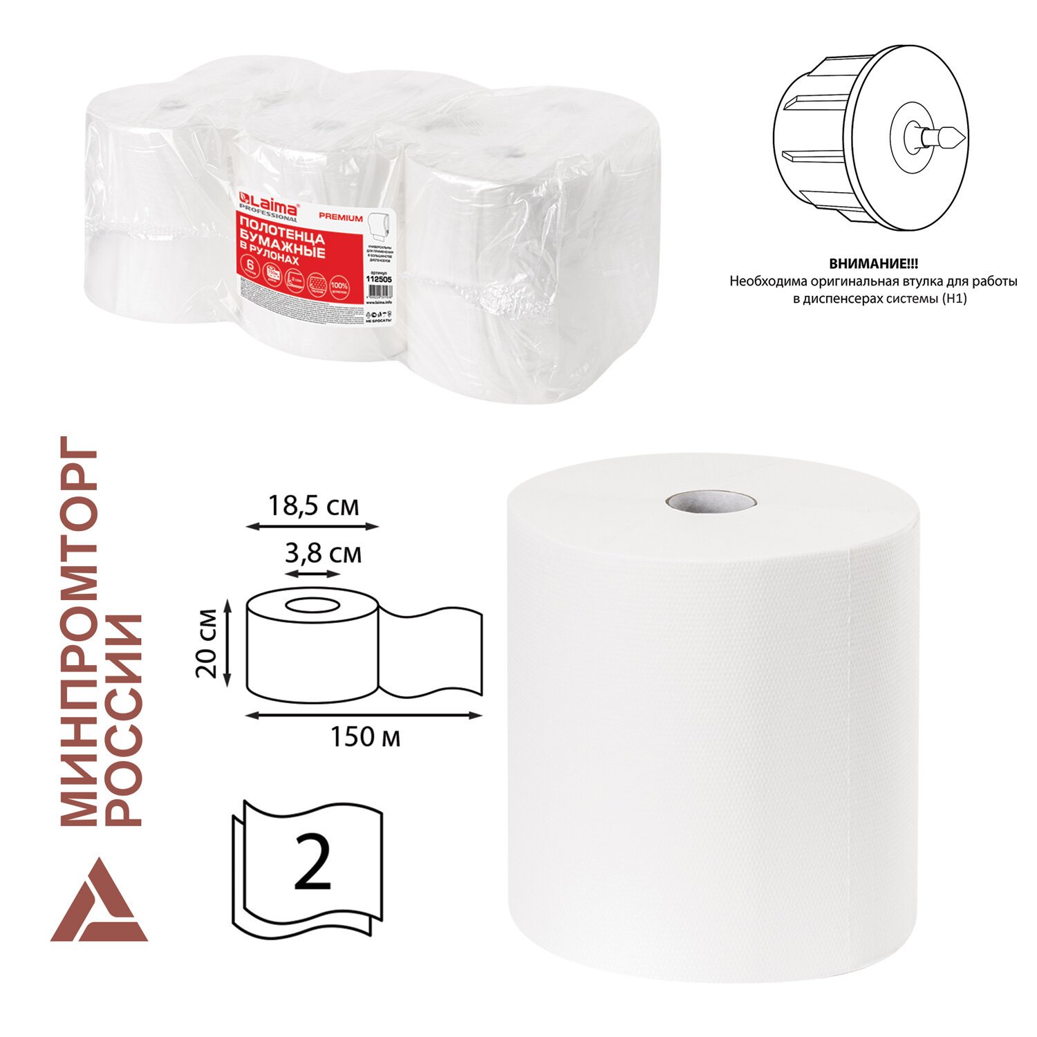 Полотенца бумажные рулонные 150 м, LAIMA (Система H1) PREMIUM, 2-слойные, белые, КОМПЛЕКТ 6 рулонов, 112505