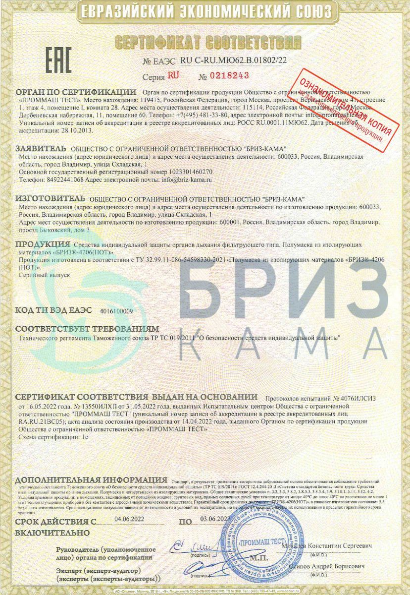 Полумаска БРИЗ®-4206 (НОТ) имеет заключение Министерства промышленности и торговли Российской Федерации о подтверждении производства средств индивидуальной защиты на территории РФ.
