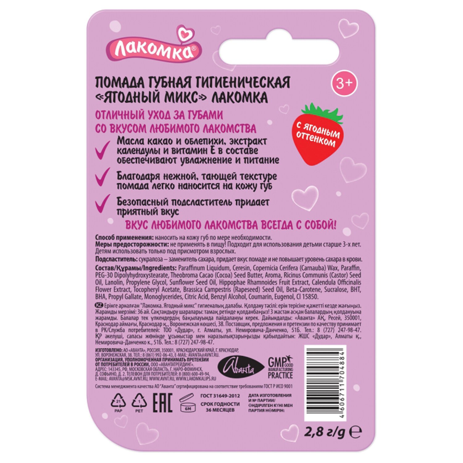 Помада гигиеническая 2,8 г, ЛАКОМКА "Ягодный микс", 1472