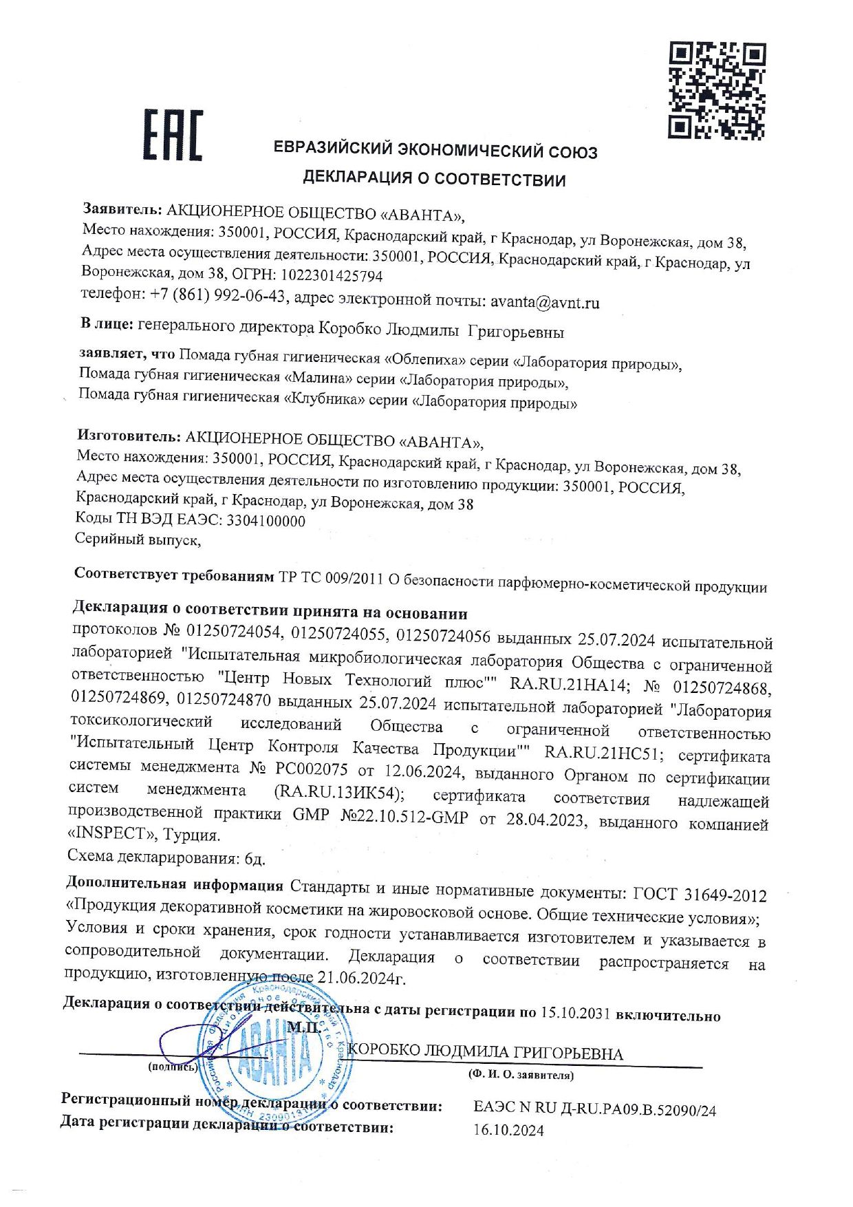 Гигиеническая помада ЛАБОРАТОРИЯ ПРИРОДЫ "Клубника" с приятным ароматом малины предназначена для ежедневного мягкого ухода за губами.
