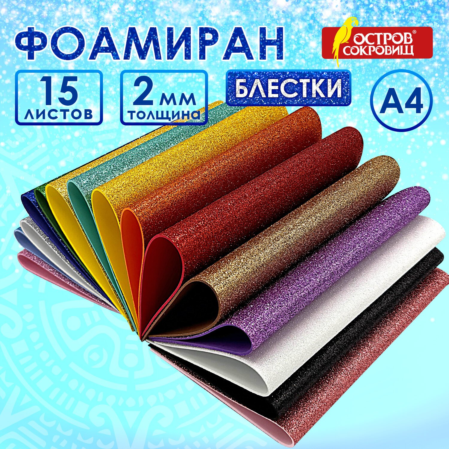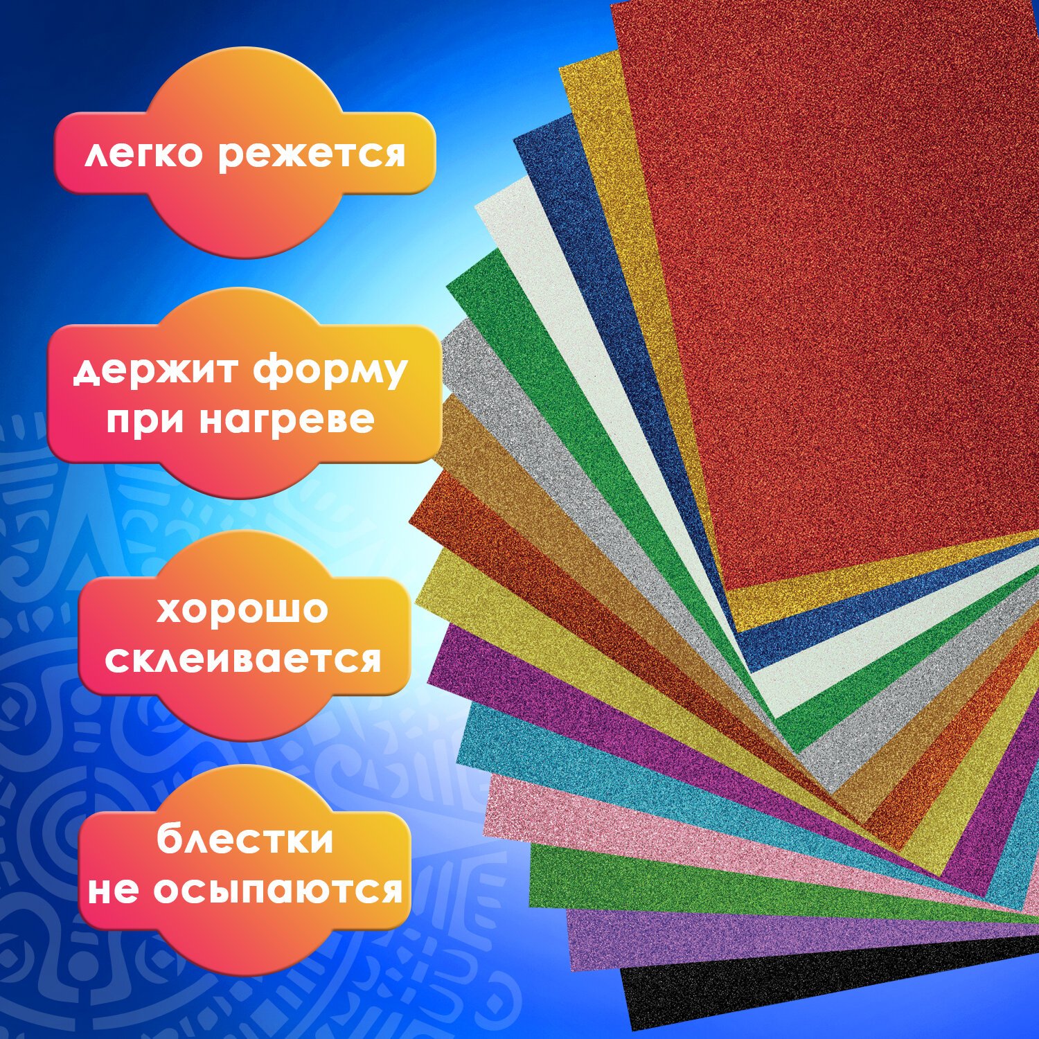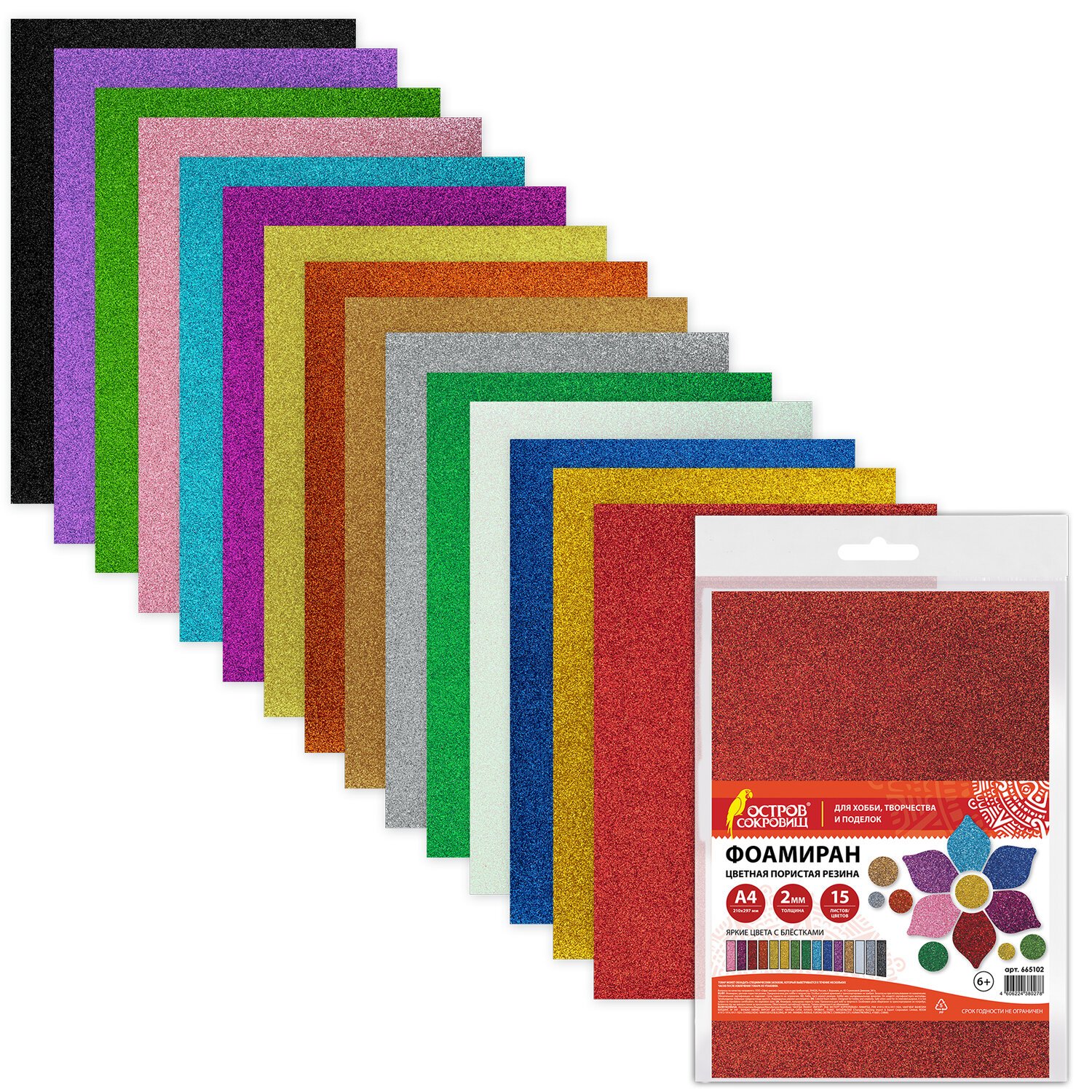 Пористая резина/фоамиран А4, 2 мм, 15 листов, 15 цветов, яркие цвета, блестки, ОСТРОВ СОКРОВИЩ, 665102