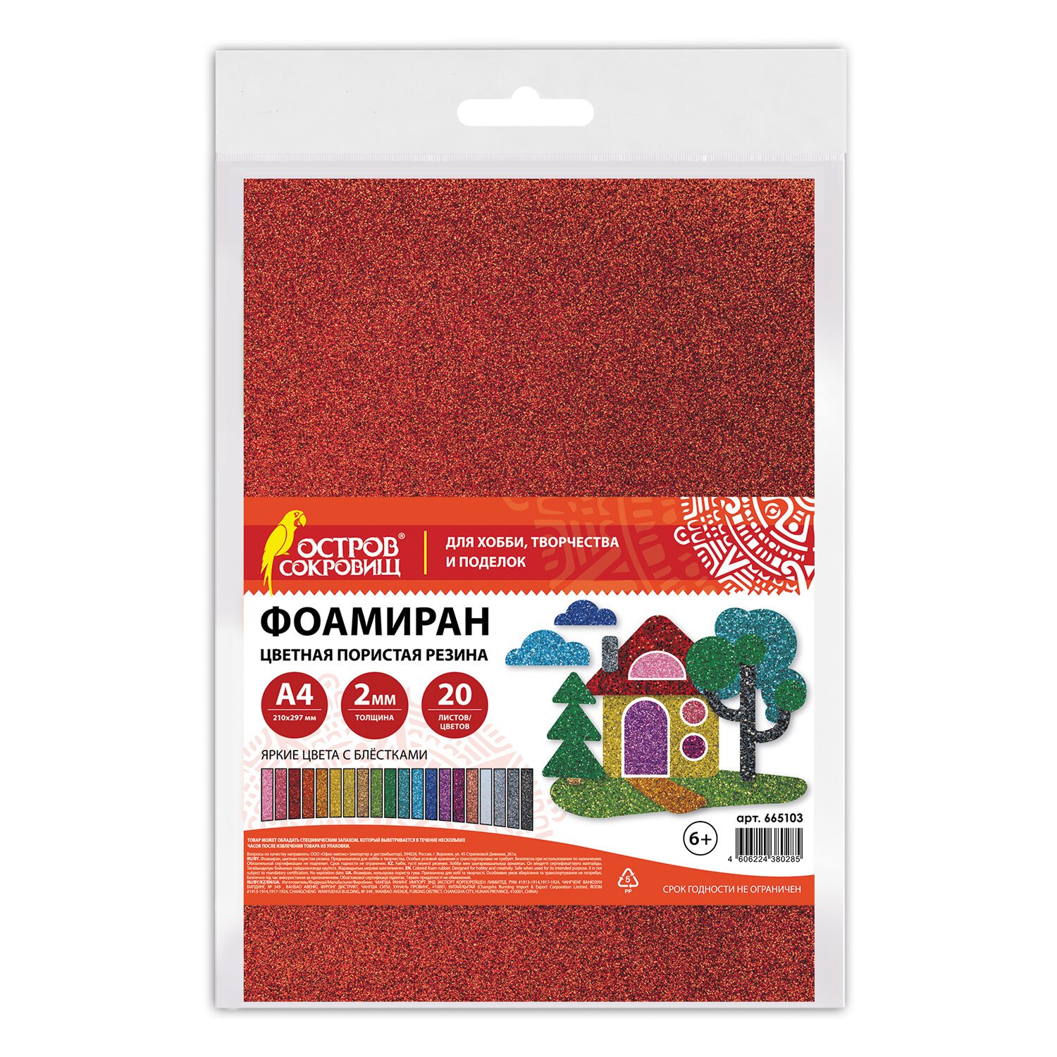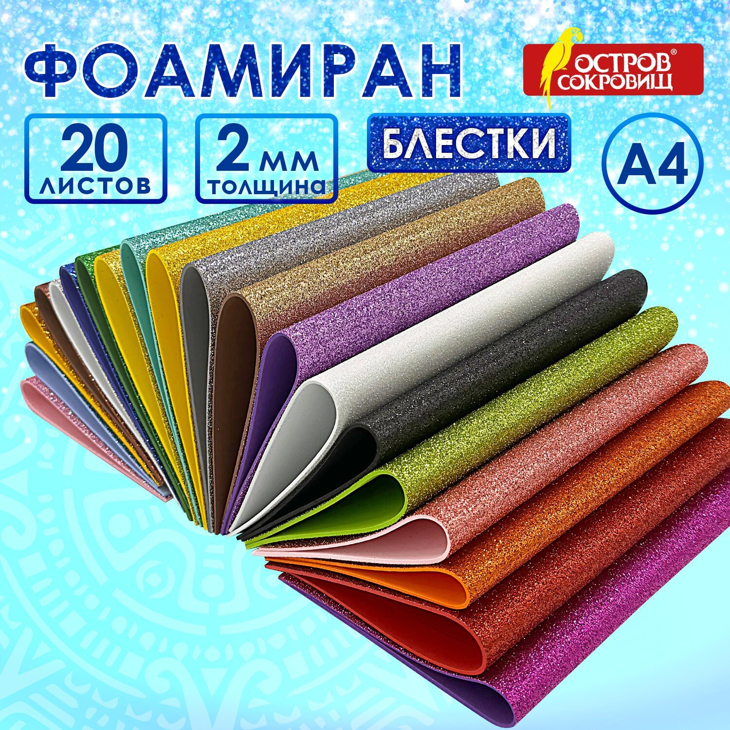 Пористая резина/фоамиран А4, 2 мм, 20 листов, 20 цветов, яркие цвета, блестки, ОСТРОВ СОКРОВИЩ, 665103