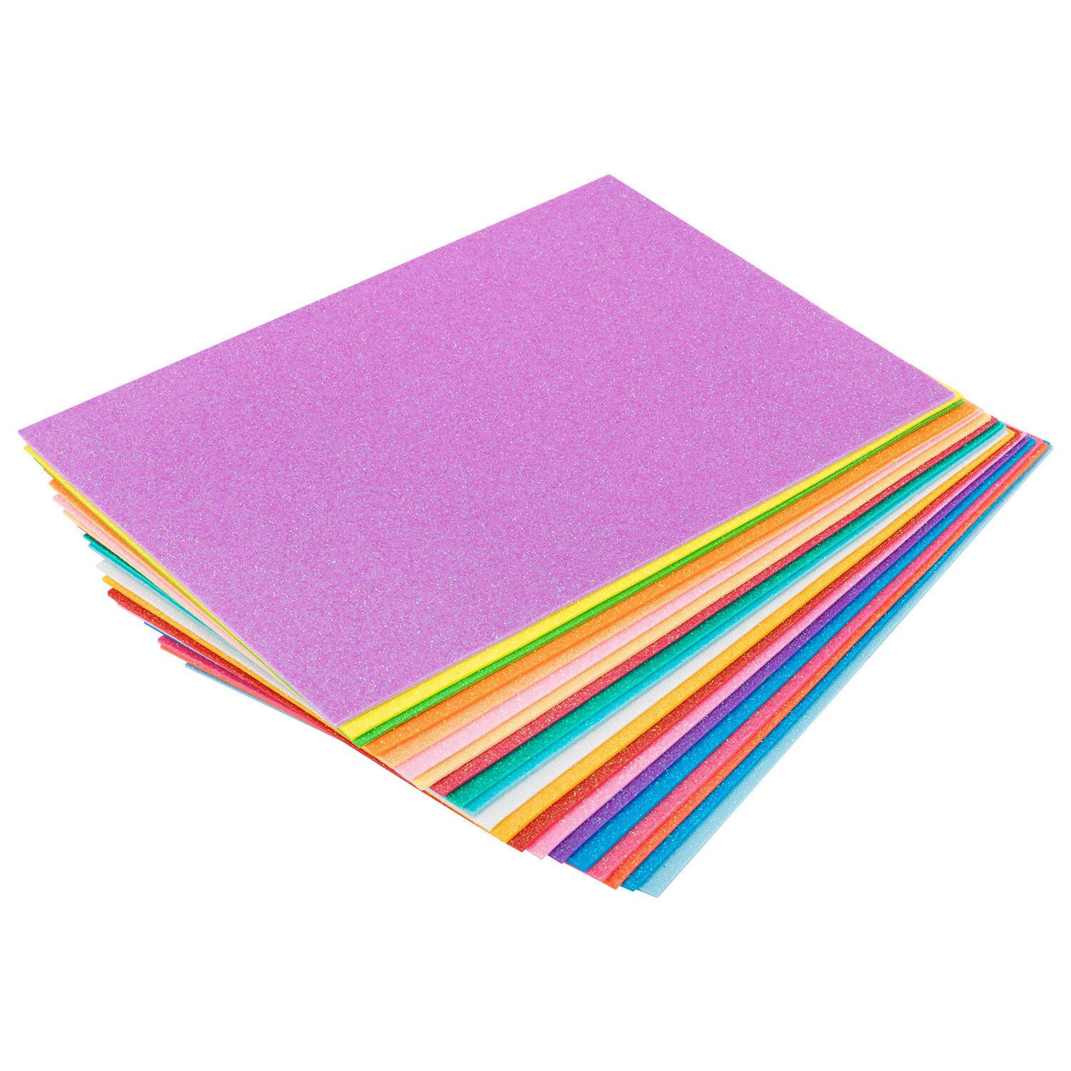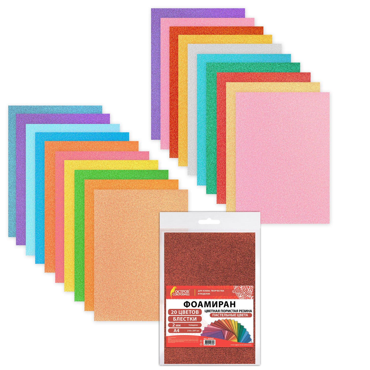Пористая резина/фоамиран А4, 2 мм, 20 листов, 20 цветов, яркие цвета, блестки, ОСТРОВ СОКРОВИЩ, 665103