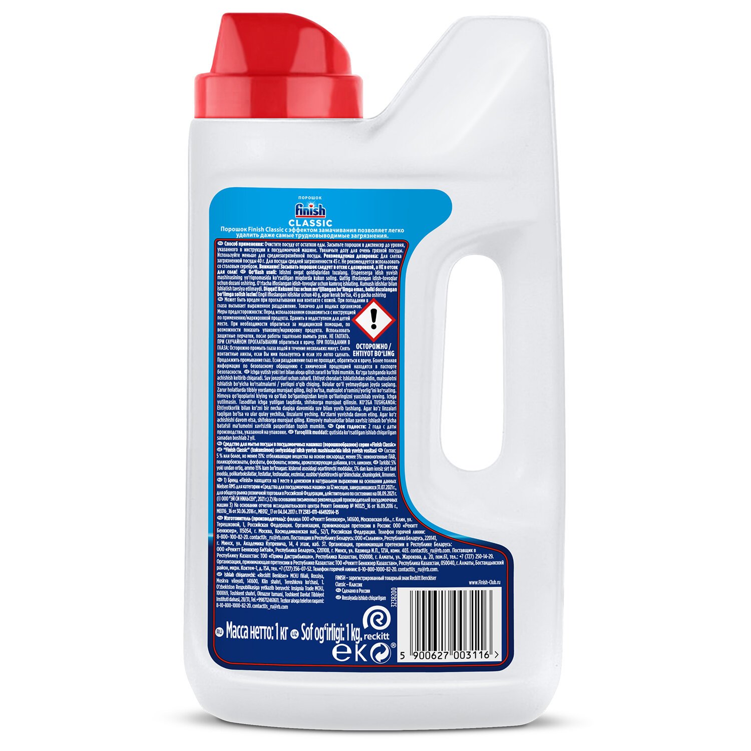 Порошок FINISH Classic – удобный формат средства для посудомоечной машины, который позволяет вам самостоятельно дозировать продукт, исходя из степени загрязнения и заполненности вашей посудомойки. FINISH Classic с эффектом замачивания позволяет легко удалить даже самые трудновыводимые загрязнения. Экономичное решение для чистоты вашей посуды. При использовании порошка FINISH Classic для достижения максимального результата и при очень жесткой воде рекомендуется применение специальной соли FINISH и ополаскивателя FINISH.