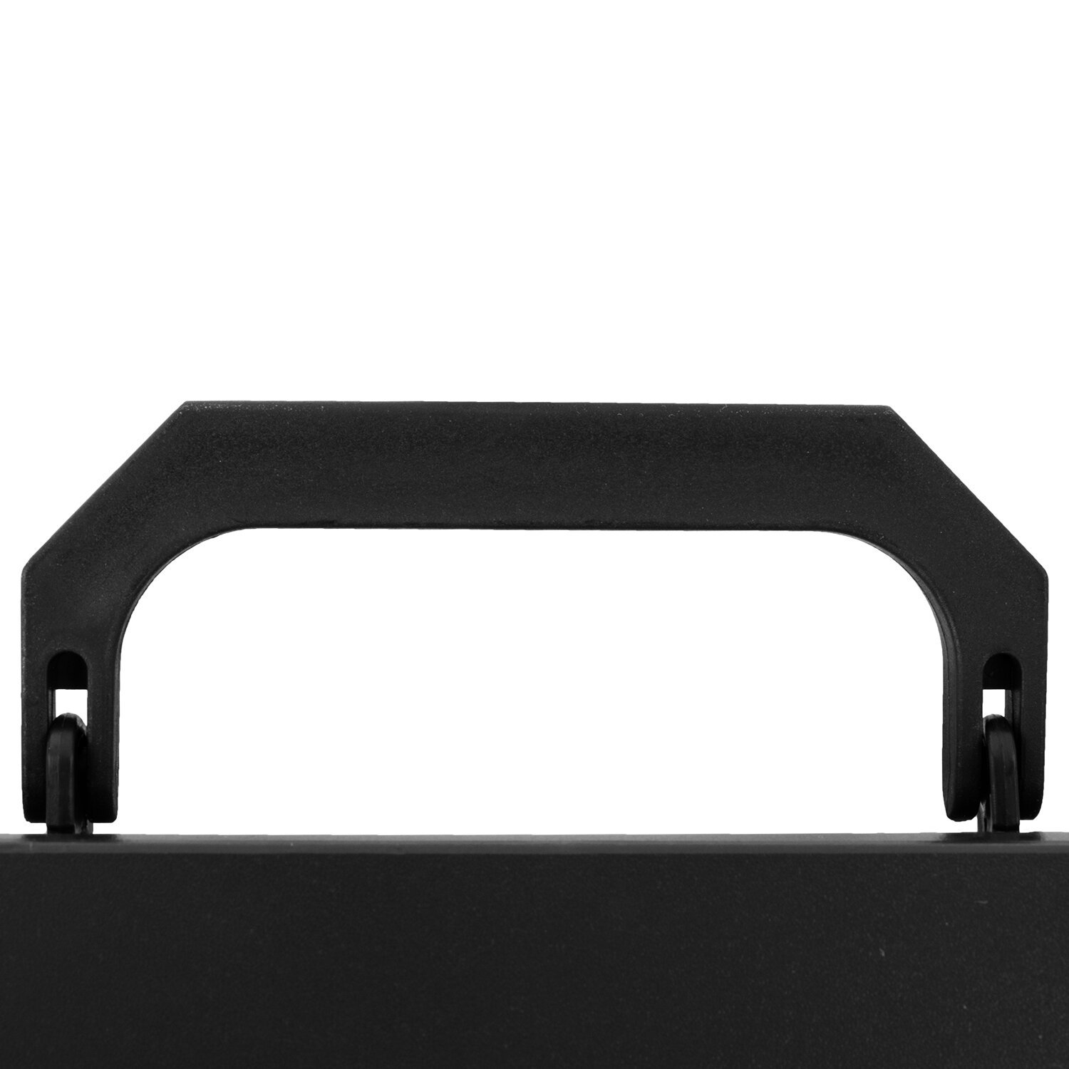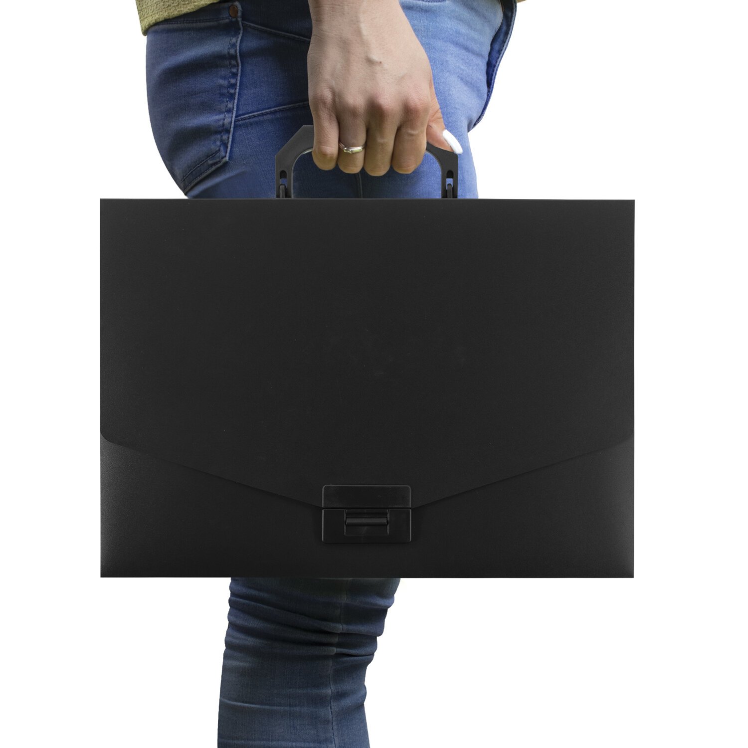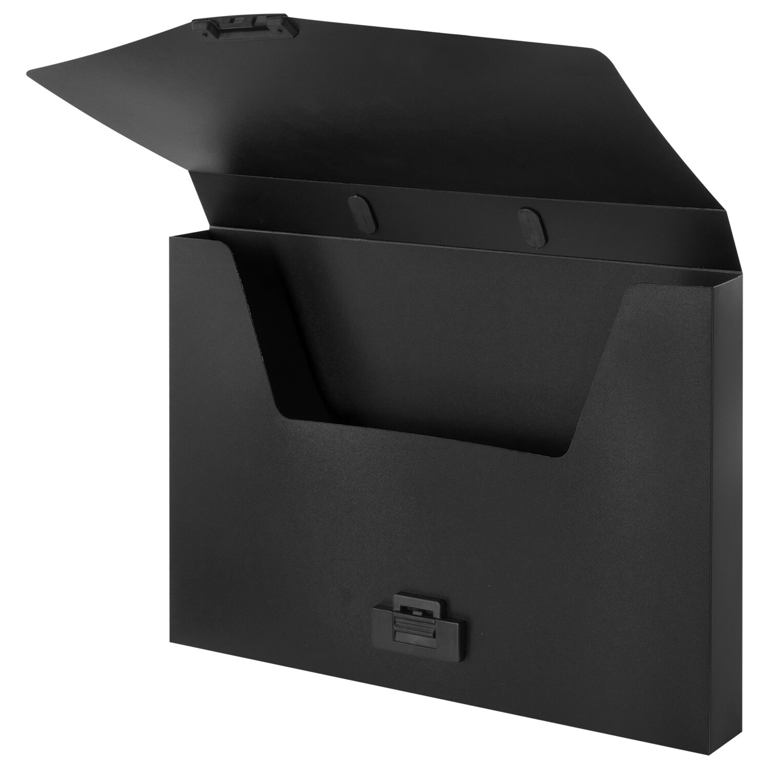 Портфель формата А4 (320х225х36 мм) изготовлен из пластика толщиной 0,6 мм, выполнен в черном цвете с фактурой "песок". Складная ручка обеспечивает компактность изделия. Портфель застегивается на клапан. Края окантованы тканью с металлическими рейками по краям окантовки, что придает изделию презентабельный вид.