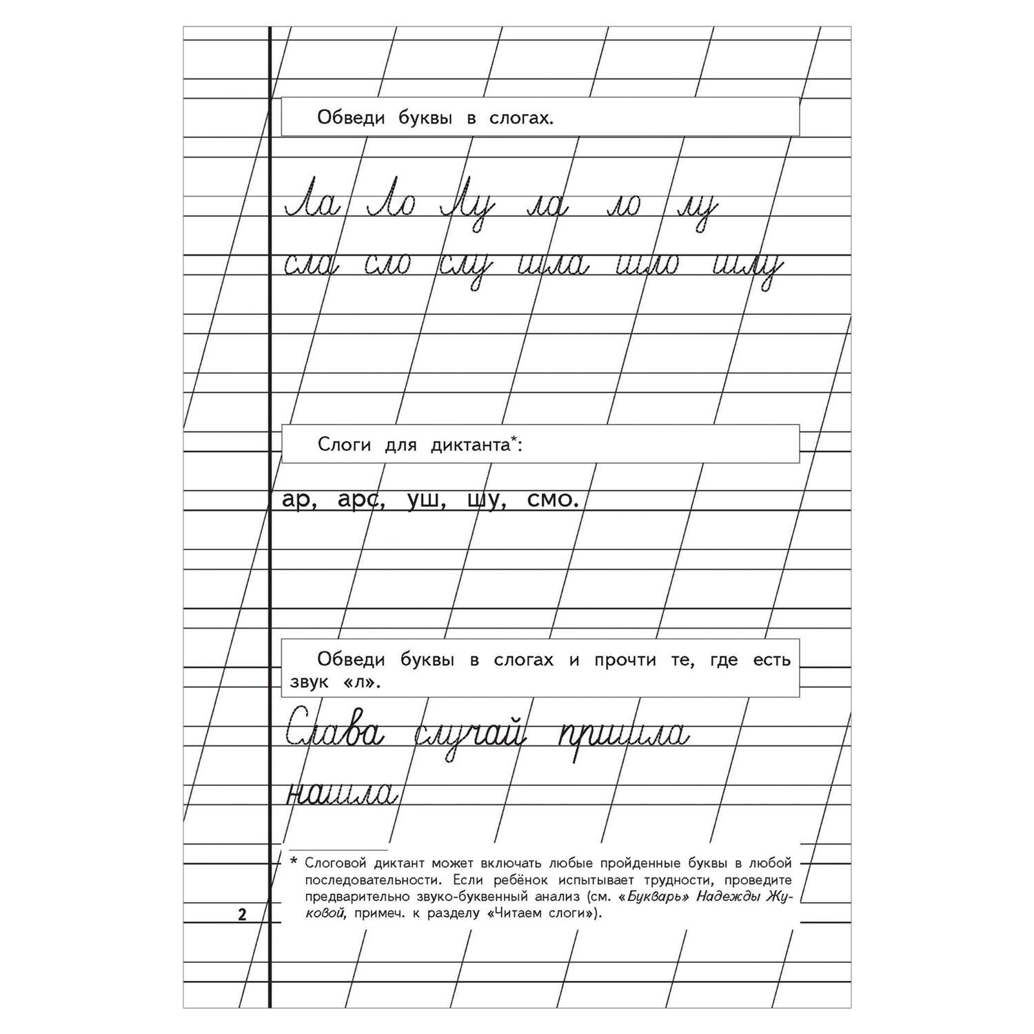 В основе обучения письму по методики Надежды Жуковой лежит слоговой принцип русской графики. Для удобства обучения материал прописей разделен на 3 тетради, с которыми желательно работать последовательно. В первой тетради изложены правила обучения написанию букв А, У, О, М, С, Ы, X, Р, Ш, Л, Н; во второй тетради – буквы К, Т, И, П, З, Й, Г, В, Д, Б, Ж, Е; в третьей тетради – буквы Ь, Я, Ю, Ё, Ч, Э, У, Ф, Щ.