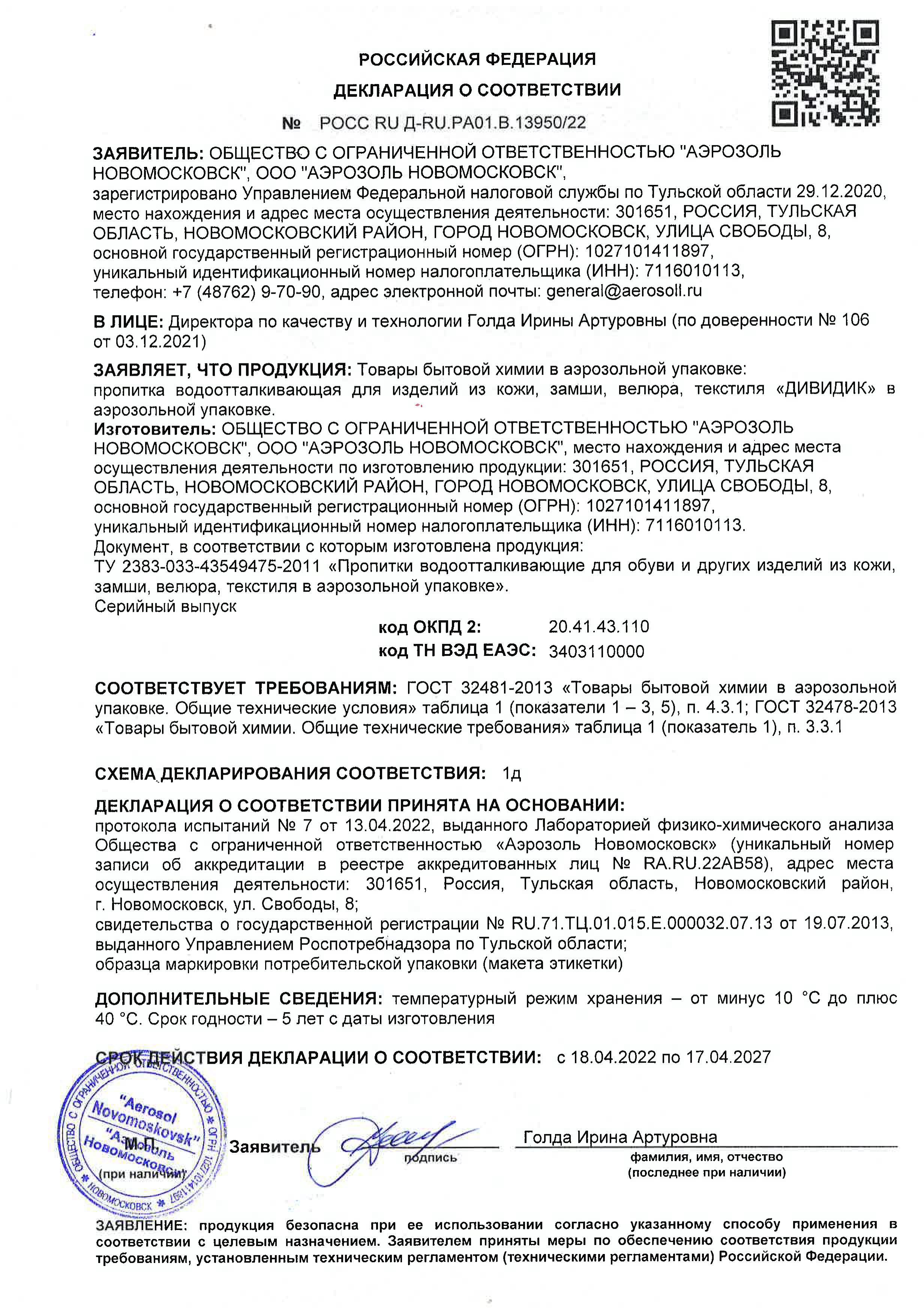Пропитка аэрозольная ДИВИДИК обеспечивает эффективную защиту обуви, одежды и аксессуаров от негативного воздействия воды, снега и грязи. Предотвращает образование пятен и солевых разводов.