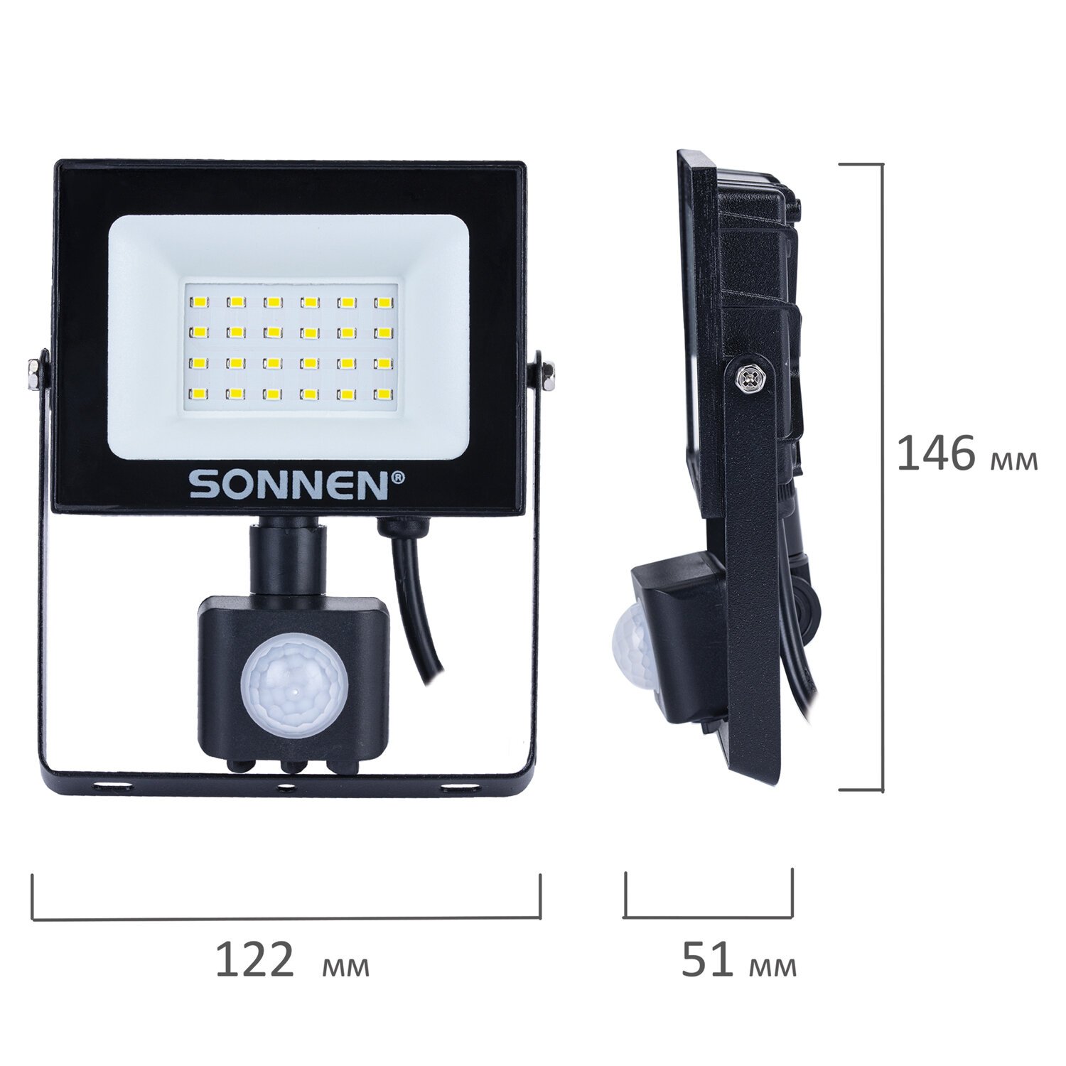 Прожектор светодиодный с датчиком движения 20Вт, 6500К, 1600Лм, IP65,122х146х51мм, черный, SONNEN, 238416