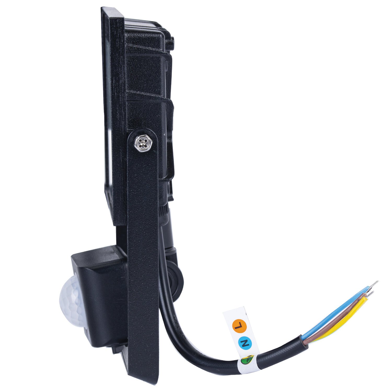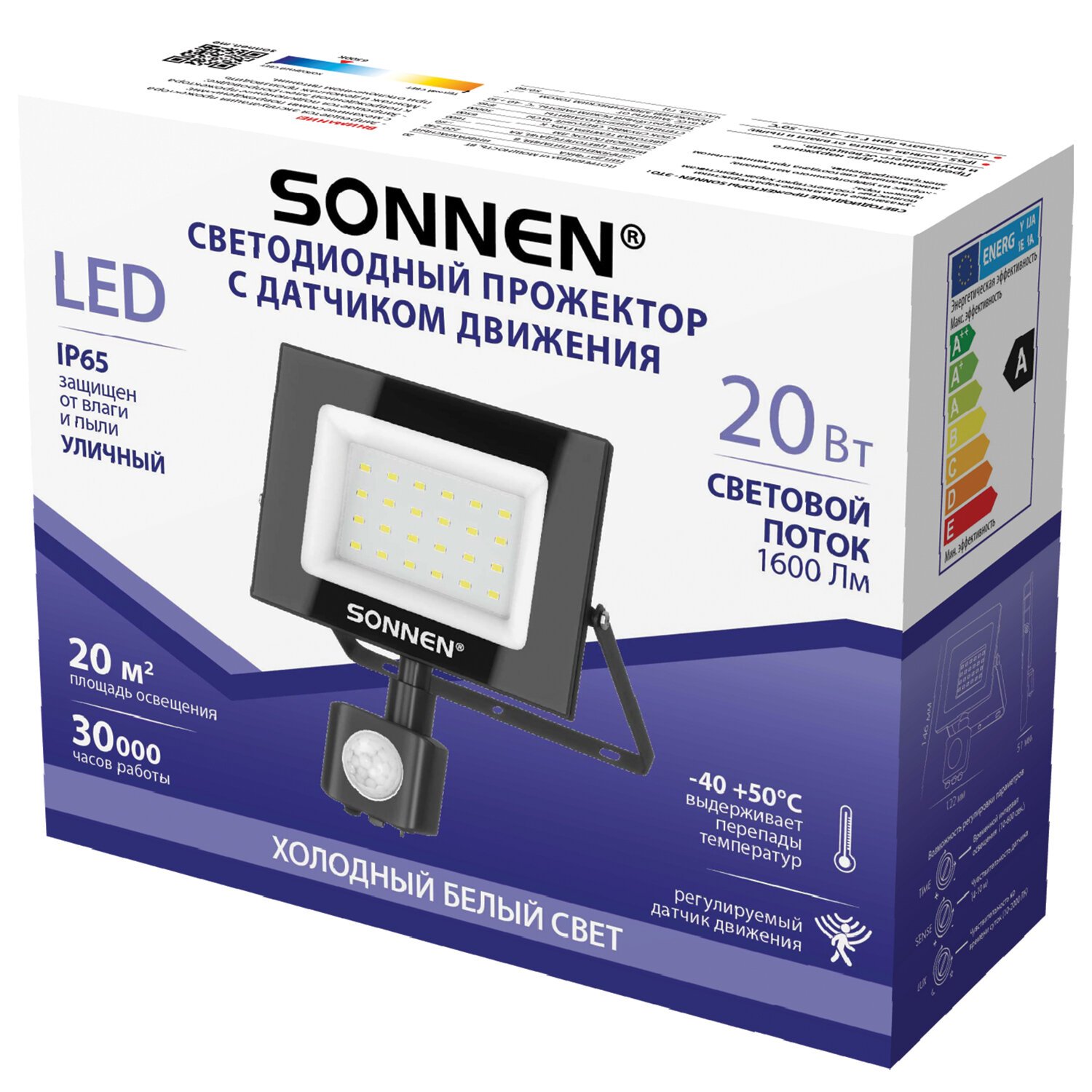 Светодиодный прожектор идеально подходит для использования в ландшафтном дизайне, архитектурной подсветке, освещении рекламных конструкций, промышленных и складских помещений. Мощность прожектора составляет 20 Вт, световой поток - 1600Лм, цветовая температура - 6500K (холодный белый свет). Имеет высокую степень пылевлагозащиты IP65, которая позволяет использовать прожектор на улице, а также в помещениях с повышенной влажностью. Светодиодный прожектор оснащен поворотным регулируемым инфракрасным датчиком движения. Регулятор TIME позволяет установить время работы прожектора после включения (от 10 секунд до 10 минут), регулятор LUX позволяет установить порог срабатывания датчика в зависимости от уровня освещенности окружающей среды от 10 люкс (ночное время) до 2000 люкс (дневное освещение), регулятор SENS позволяет установить порог чувствительности датчика в зависимости от дальности обнаружения объекта (от 4 до 10 м). Прожектор выдерживает перепады температур и работает при температуре от -40°С до +50°C. Корпус прожектора сделан из металла с антикоррозийным свойствами и дополнен закаленным стеклом.