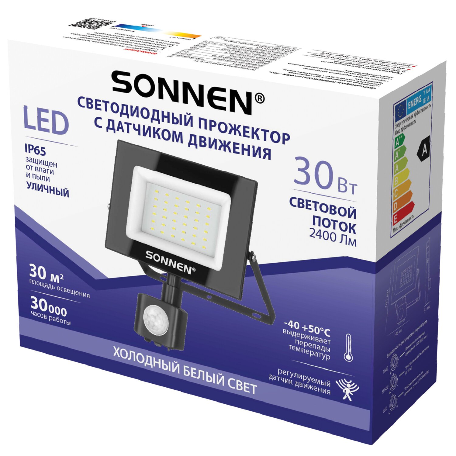 Светодиодный прожектор идеально подходит для использования в ландшафтном дизайне, архитектурной подсветке, освещении рекламных конструкций, промышленных и складских помещений. Мощность прожектора составляет 30 Вт, световой поток - 2400Лм, цветовая температура - 6500K (холодный белый свет). Имеет высокую степень пылевлагозащиты IP65, которая позволяет использовать прожектор на улице, а также в помещениях с повышенной влажностью. Светодиодный прожектор оснащен поворотным регулируемым инфракрасным датчиком движения. Регулятор TIME позволяет установить время работы прожектора после включения (от 10 секунд до 10 минут), регулятор LUX позволяет установить порог срабатывания датчика в зависимости от уровня освещенности окружающей среды от 10 люкс (ночное время) до 2000 люкс (дневное освещение), регулятор SENS позволяет установить порог чувствительности датчика в зависимости от дальности обнаружения объекта (от 4 до 10 м). Прожектор выдерживает перепады температур и работает при температуре от -40°С до +50°C. Корпус прожектора сделан из металла с антикоррозийным свойствами и дополнен закаленным стеклом.