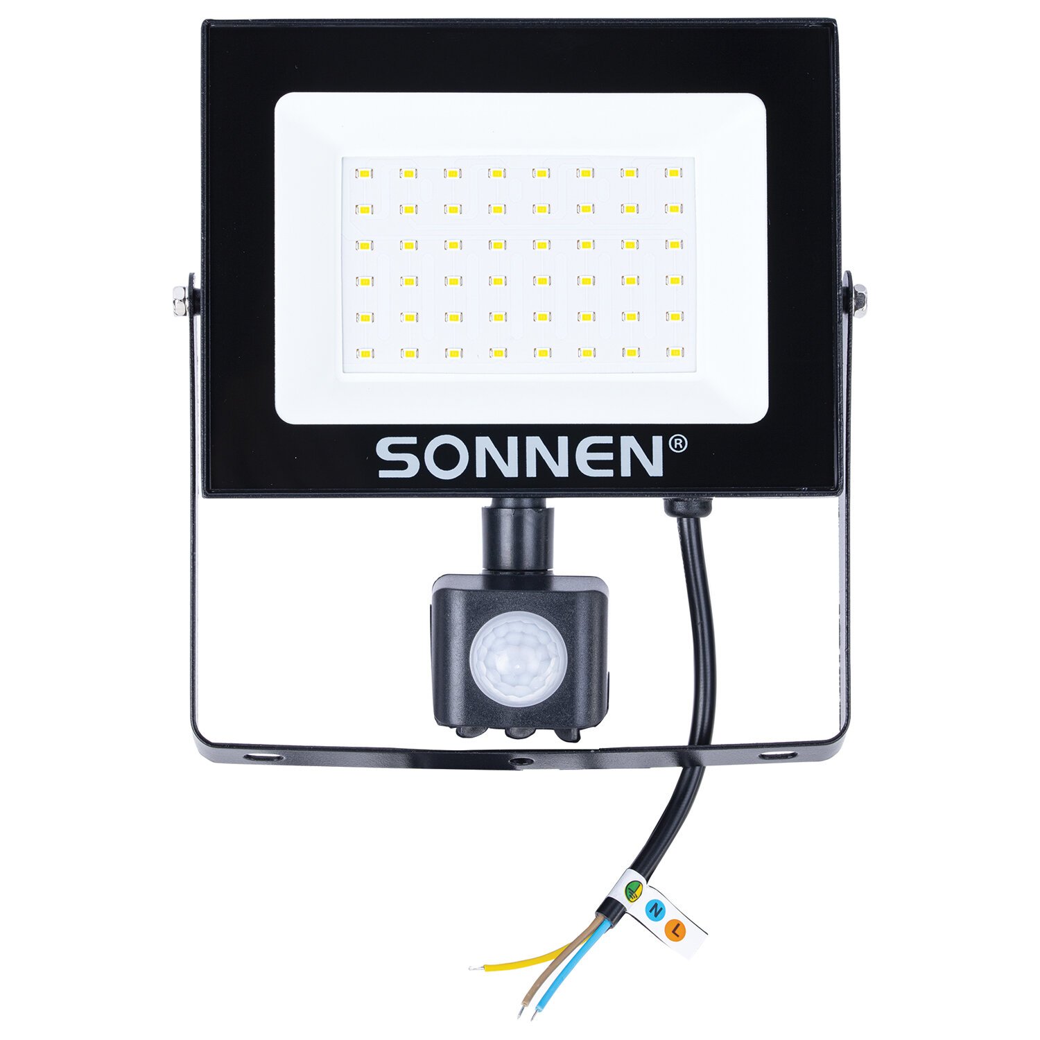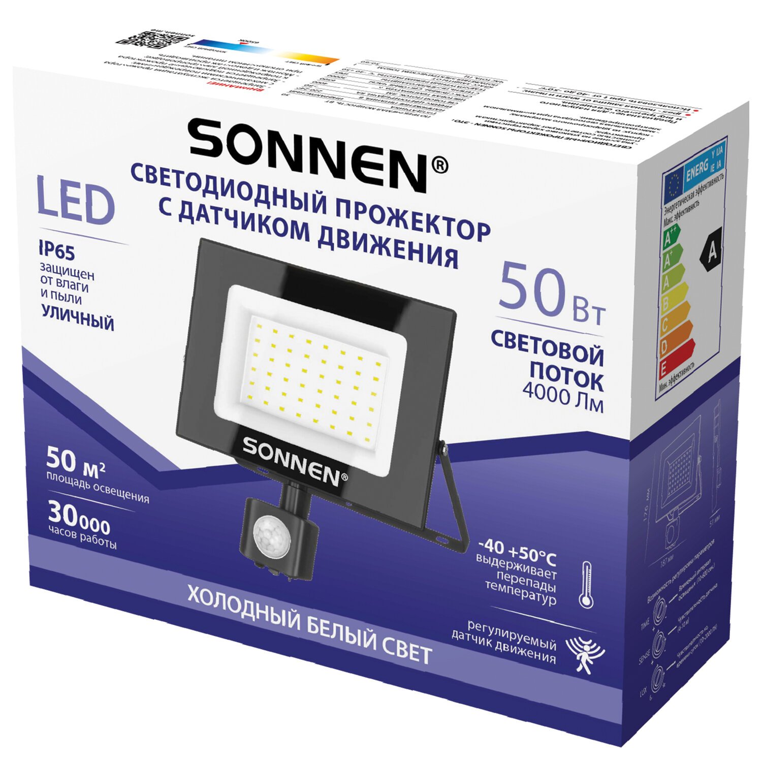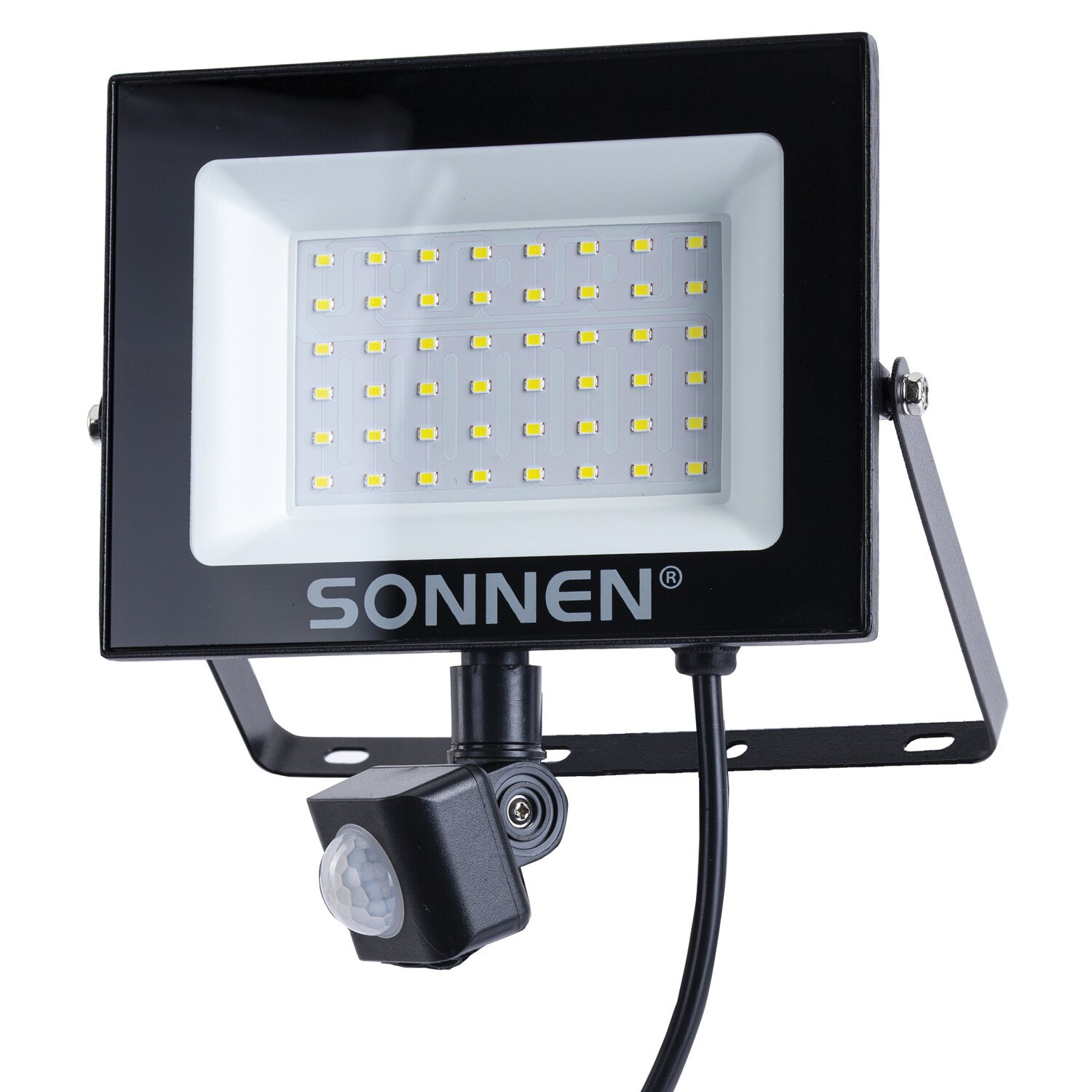 Прожектор светодиодный с датчиком движения 50Вт, 6500К, 4000Лм, IP65, 187х176х51мм, черный, SONNEN, 238418
