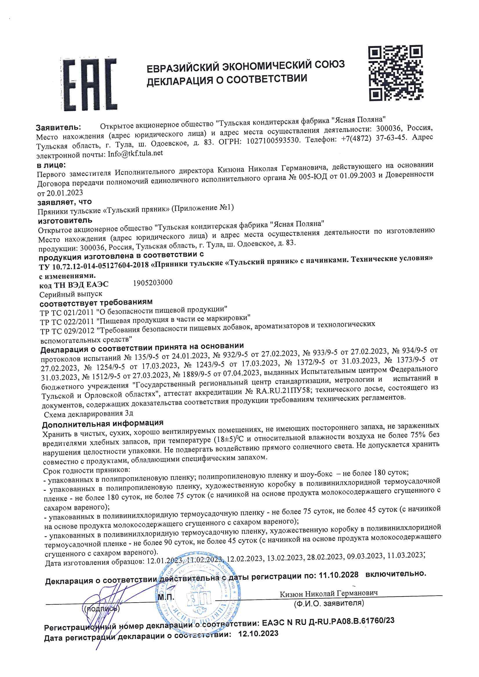 Настоящий Тульский пряник от фабрики "Ясная поляна" – фирменная сладость Тульской области. Знаменитый печатный пряник, покрытый тонкой сахарной глазурью. Ароматный мякиш с начинкой из уникальной российской сладости – вареной сгущенки.