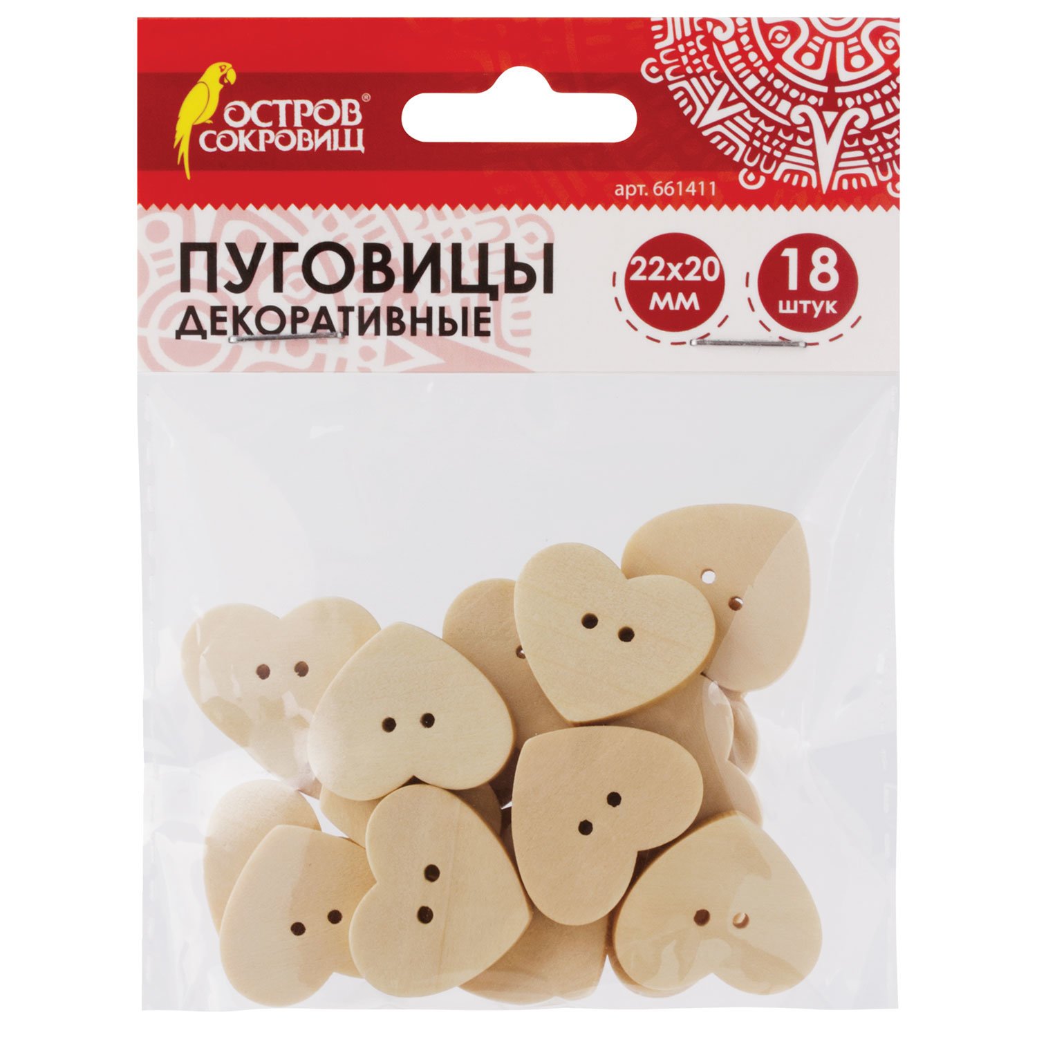 Пуговицы декоративные "Сердце", дерево, 22х20 мм, 18 шт., ОСТРОВ СОКРОВИЩ, 661411