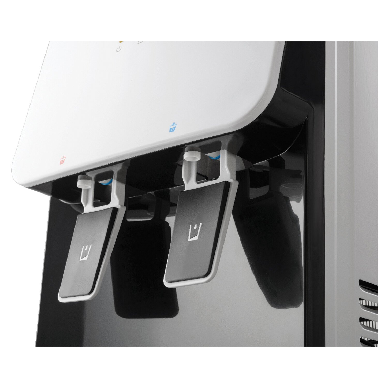 Пурифайер имеет индикацию отключения нагрева и охлаждения. Корпус выполнен в белом цвете с черной вставкой на передней панели.
