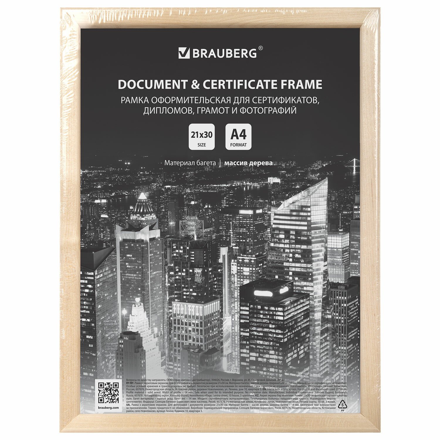 Рамка 21х30 см, дерево, багет 14 мм, BRAUBERG "Elegant", цвет натуральный, акриловый экран, 391296