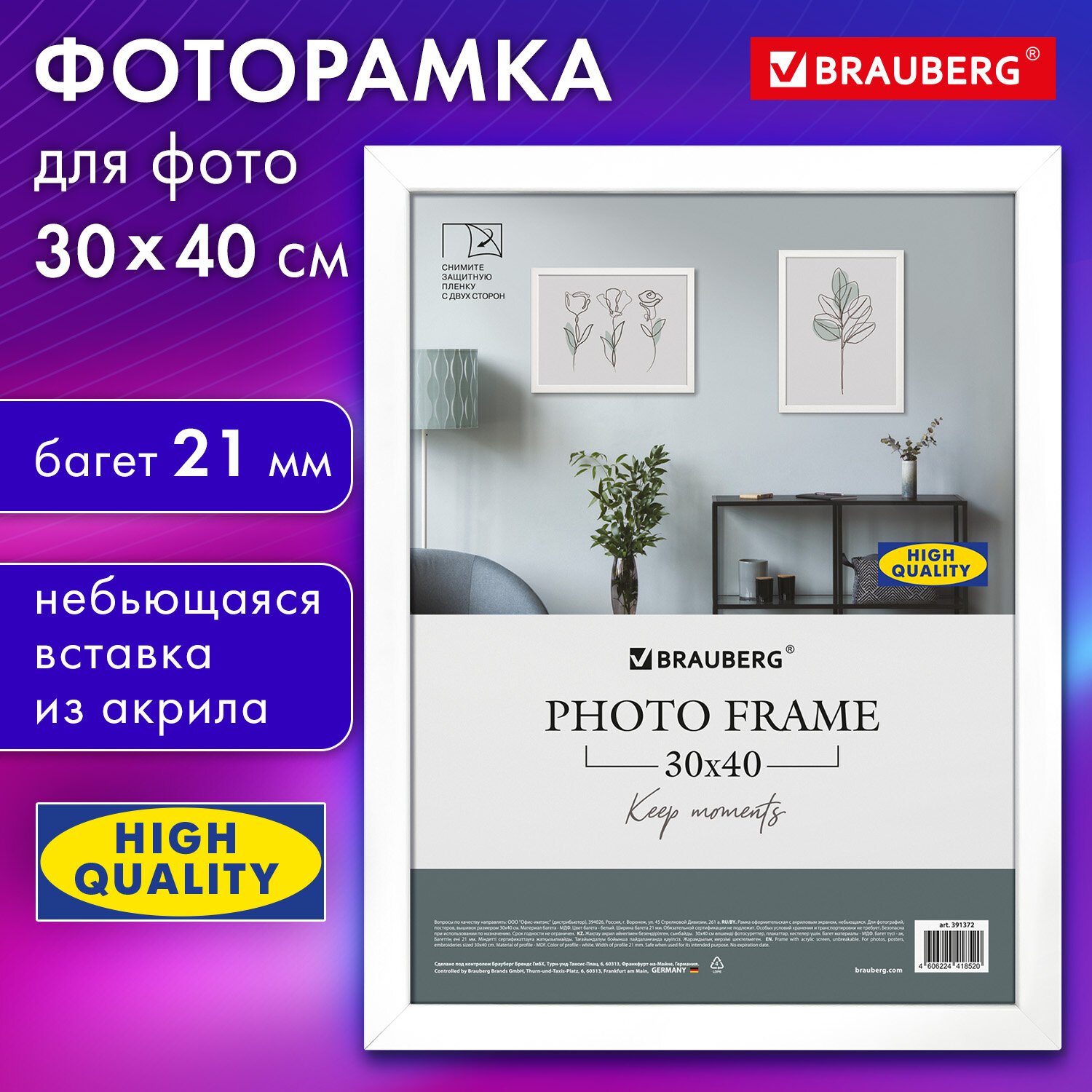 Рамка 30х40 см небьющаяся, аналог IKEA, багет 21 мм, МДФ, BRAUBERG "Idea", белая, 391372