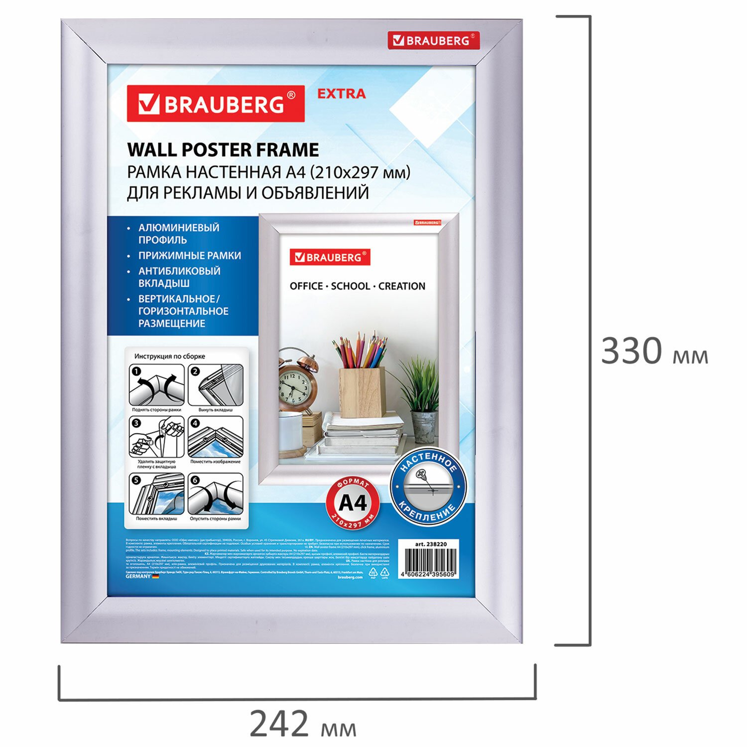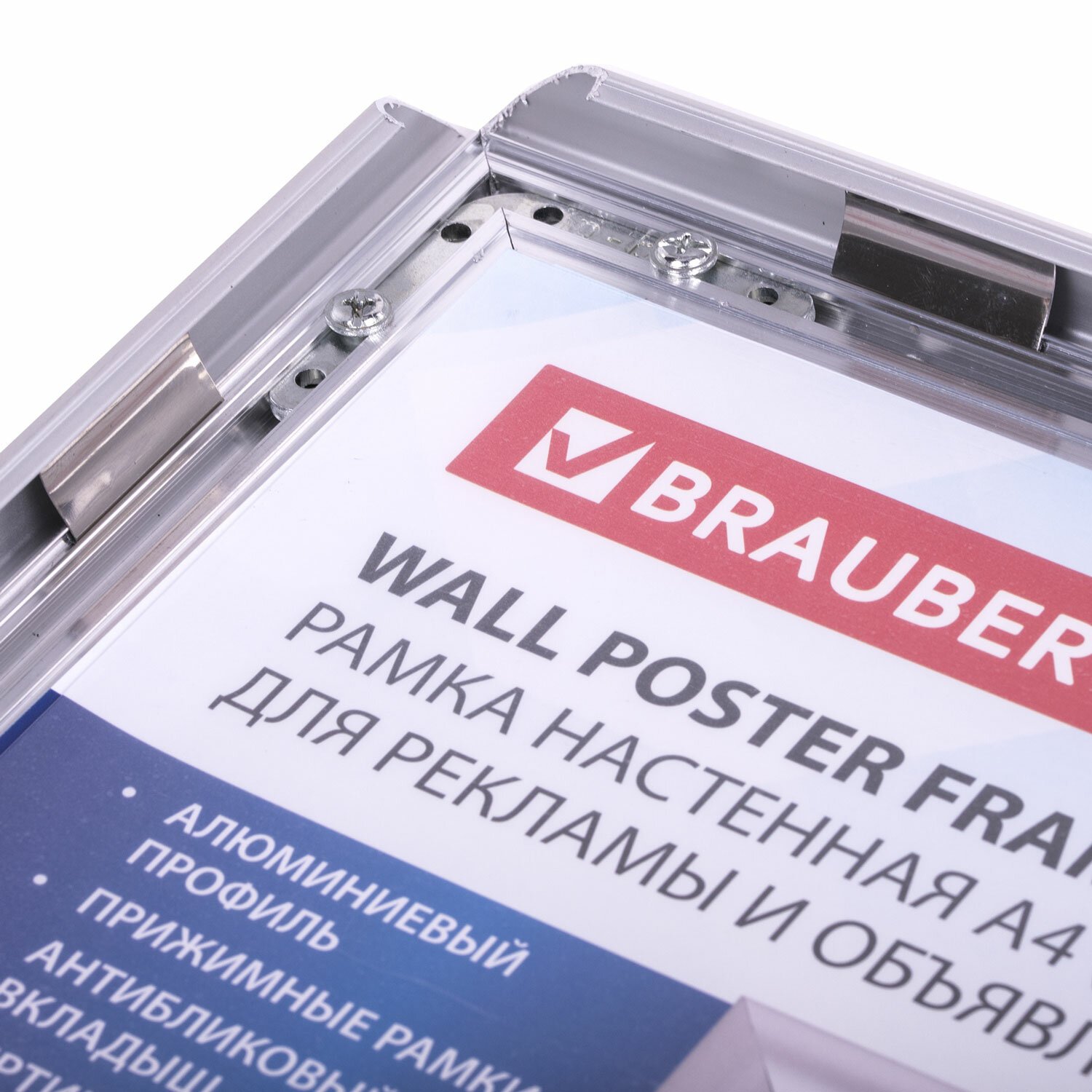 Рамка настенная для рекламы, А4 (210х297 мм), алюминиевый профиль, прижимные стороны, BRAUBERG, 232203