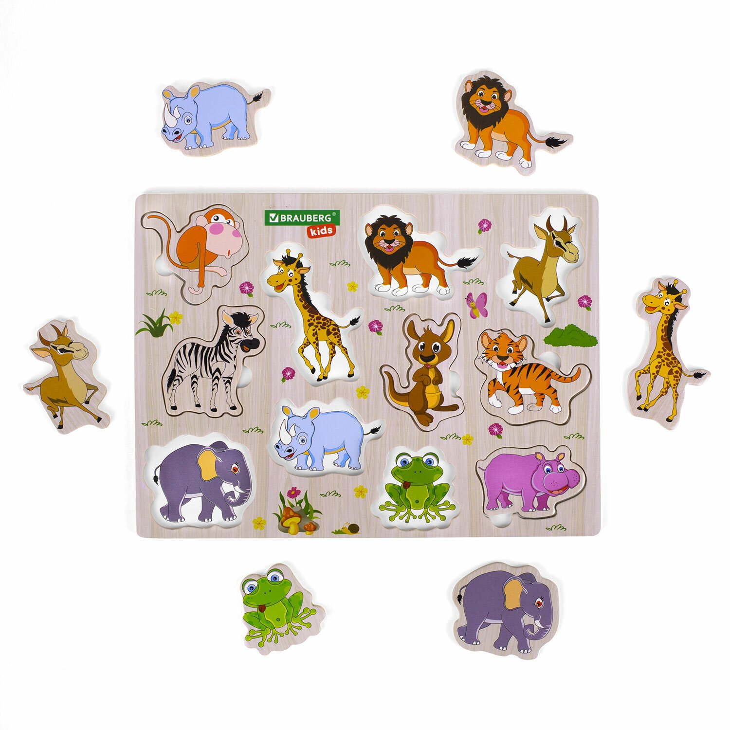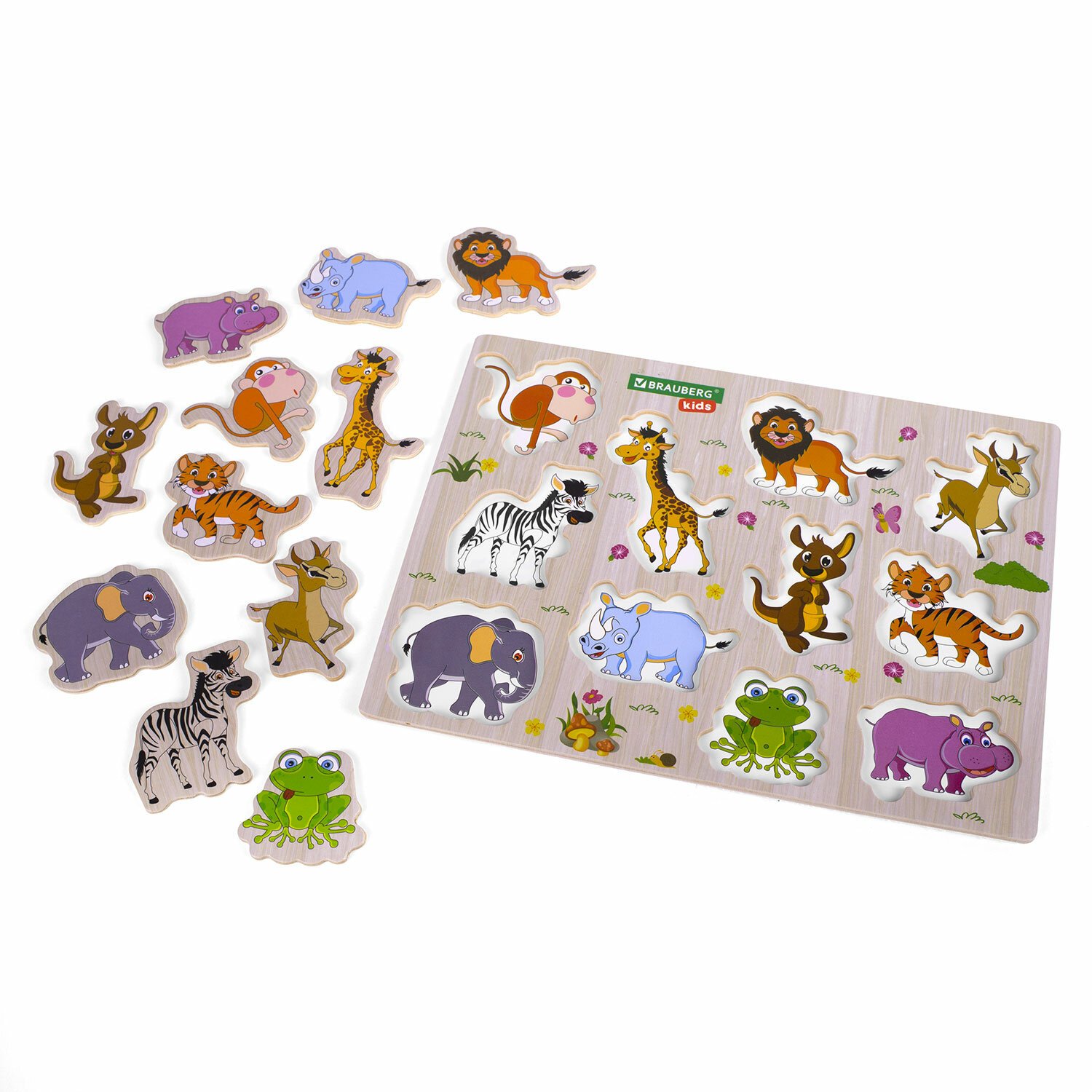 Пазл деревянный развивающий для детей "Дикие животные", 17х17 см, BRAUBERG KIDS, 665250