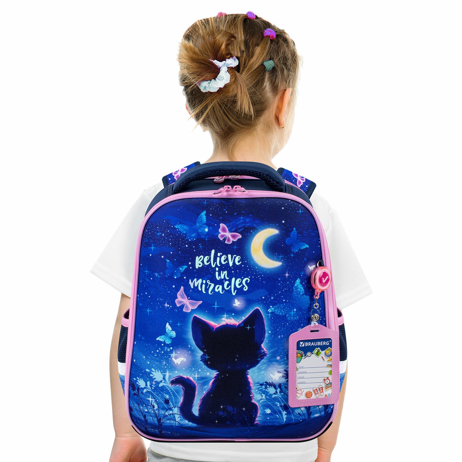 В комплекте с ранцем поставляется бейдж для пропуска на рулетке. Для его надежной фиксации на одной из лямок ранца имеется специальное металлическое кольцо. Это очень удобно и экономит массу времени – ребенок просто прикладывает пропуск к турникету, вытягивая его на нужное расстояние, а рулетка автоматически возвращает его обратно. Пропуск всегда под рукой!