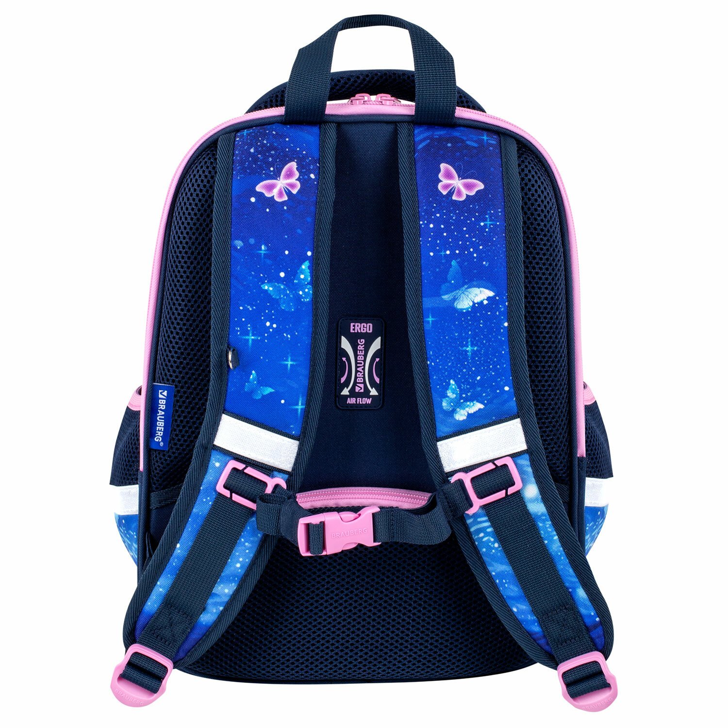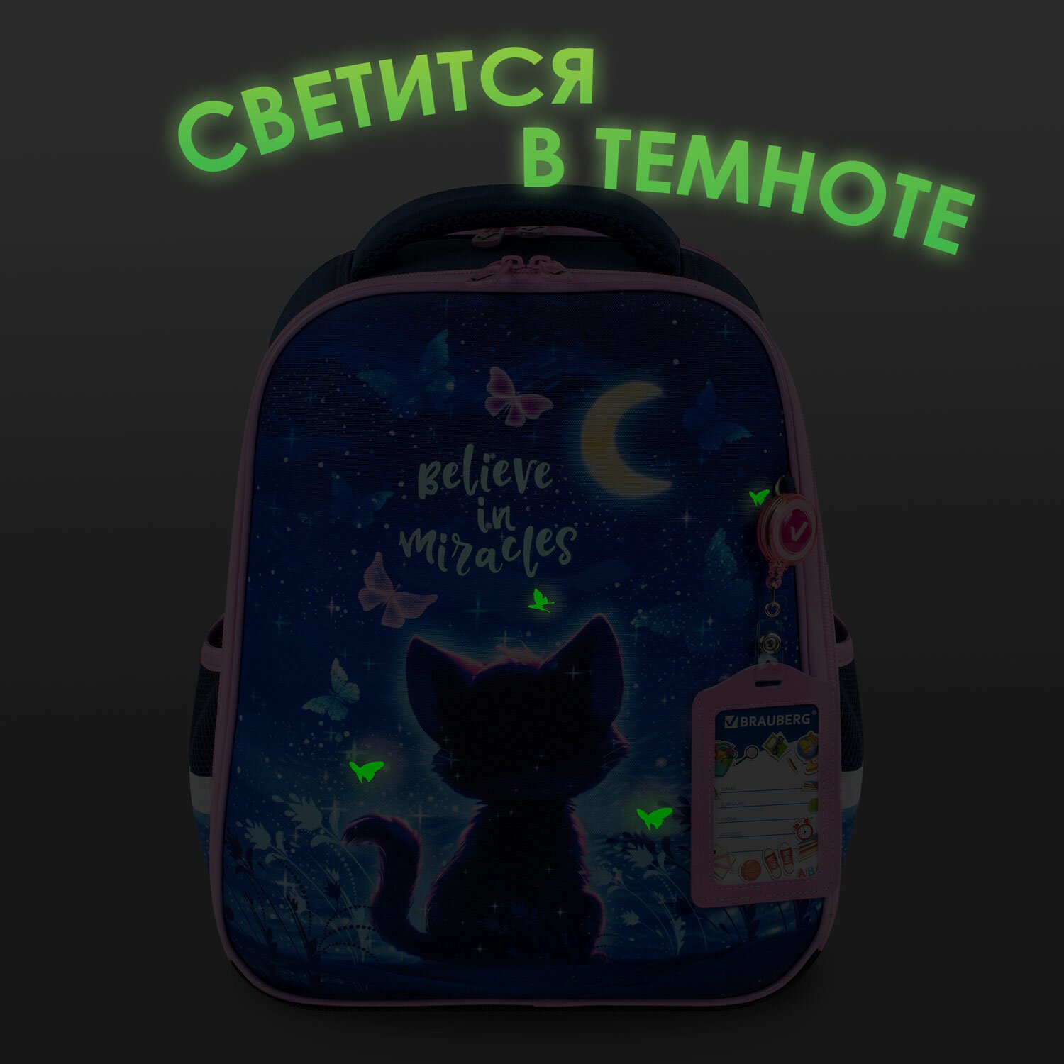 Бабочки на передней панели ранца светятся в темноте! Светящийся эффект реализован с помощью современной и технологичной печати на ткани специальной краской. Эффект свечения достигается за счёт накопления дневного или искусственного света.